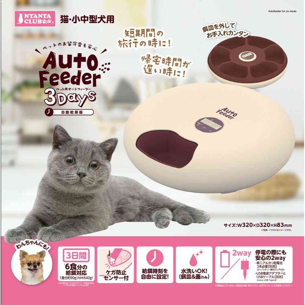 ・簡単タイマー設定で、ネコちゃんや、ワンちゃんにご飯が与えられ、忙しい飼い主さんの味方! ・おやつタイムに設定して、お留守番時もペットを喜ばせることもできます。 ・6食分の給餌設定で、帰宅時が遅い時や、短期間の旅行にもピッタリ! ・容量:約90g×6回分(合計約540g) ・適応種:猫、小中型犬 <電源方式> ・乾電池(単二アルカリ乾電池3本)※別売 ・USB電源アダプター(5V/1A~2.1A)※別売 ・USBケーブル(micro USB Type-B)※別売