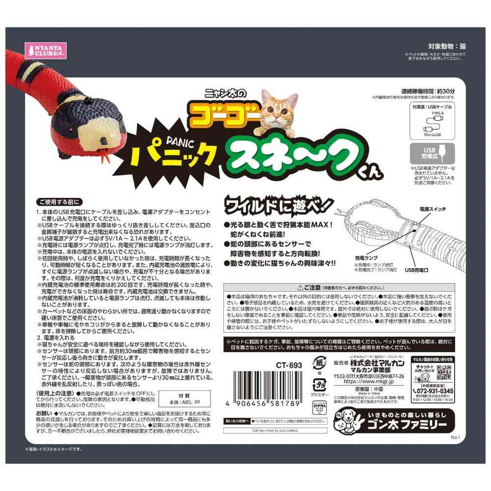 ・電池で動くリアルなへびのおもちゃです。 ・光る眼と動く舌で狩猟本能MAX!ヘビがくねくね前進します ・ヘビの頭部にあるセンサーで障害物を感知すると方向転換。動きの変化に猫ちゃん興味津々! ・USB充電式 ※USBアダプターは含まれていません。必ず5V/1A~2.1Aを別途ご用意ください。
