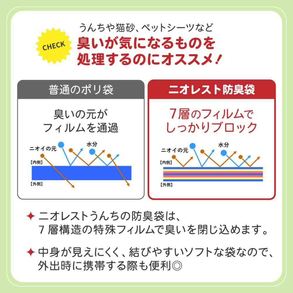 ・7層構造の特殊フィルムで臭いを閉じ込める。 ・中身が見えにくく結びやすいソフトな袋