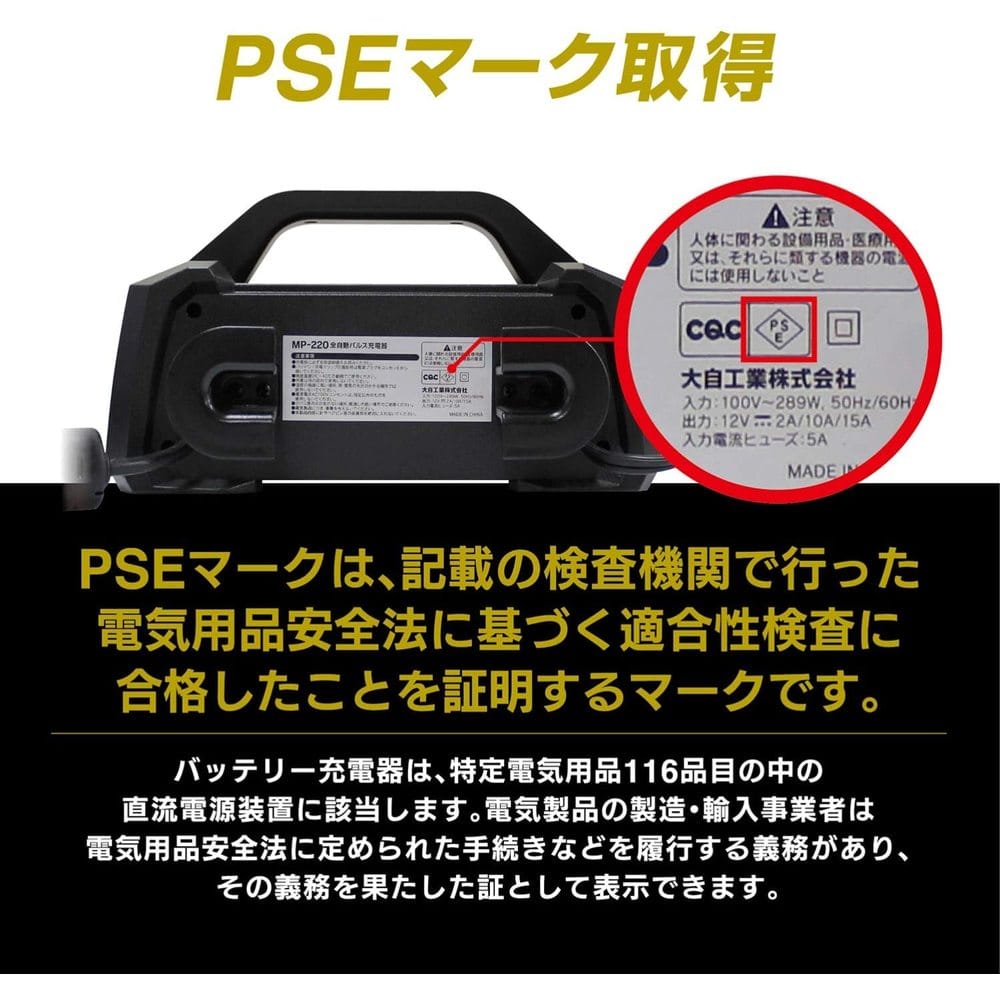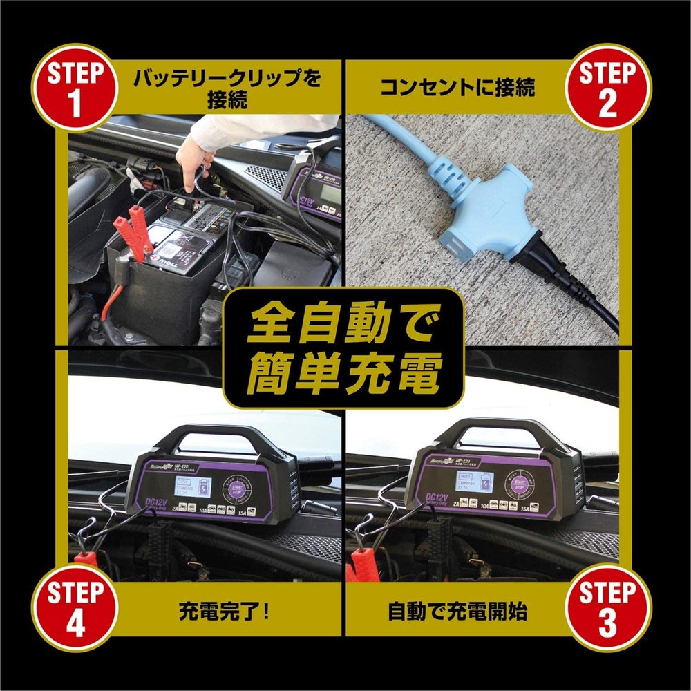 ●コンセント(AC100V)からDC12Vバッテリーへ充電する機器です。●入力電圧(V):AC100●適合バッテリー(V):12●幅(mm):250●奥行(mm):178●高さ(mm):133●保護機能:出力カット(逆接続、クリップ接続、不良、電圧確認、高温、タイムオーバー、短絡)●最大電流(A):15●出力電圧(V):DC12●ケーブル長(m):約1.7(電源コード)約1.7(充電コード)●対応例:オートバイ、軽自動車、普通自動車、小型農機、ハイブリッド車、アイドリングストップ車●定格入力:AC100V、50/60Hz、289W●適合バッテリー:DC12V(開放型・密閉型・AGM・ISS)鉛バッテリー●定格出力:DC12V/15A(最大電流)●適合バッテリー容量:4~140Ah●保護機能:出力カット(逆接続、クリップ接続、不良、電圧確認、高温、タイムオーバー、短絡)●充電方式:定電流定電圧/オート充電方式 質量1.400kg