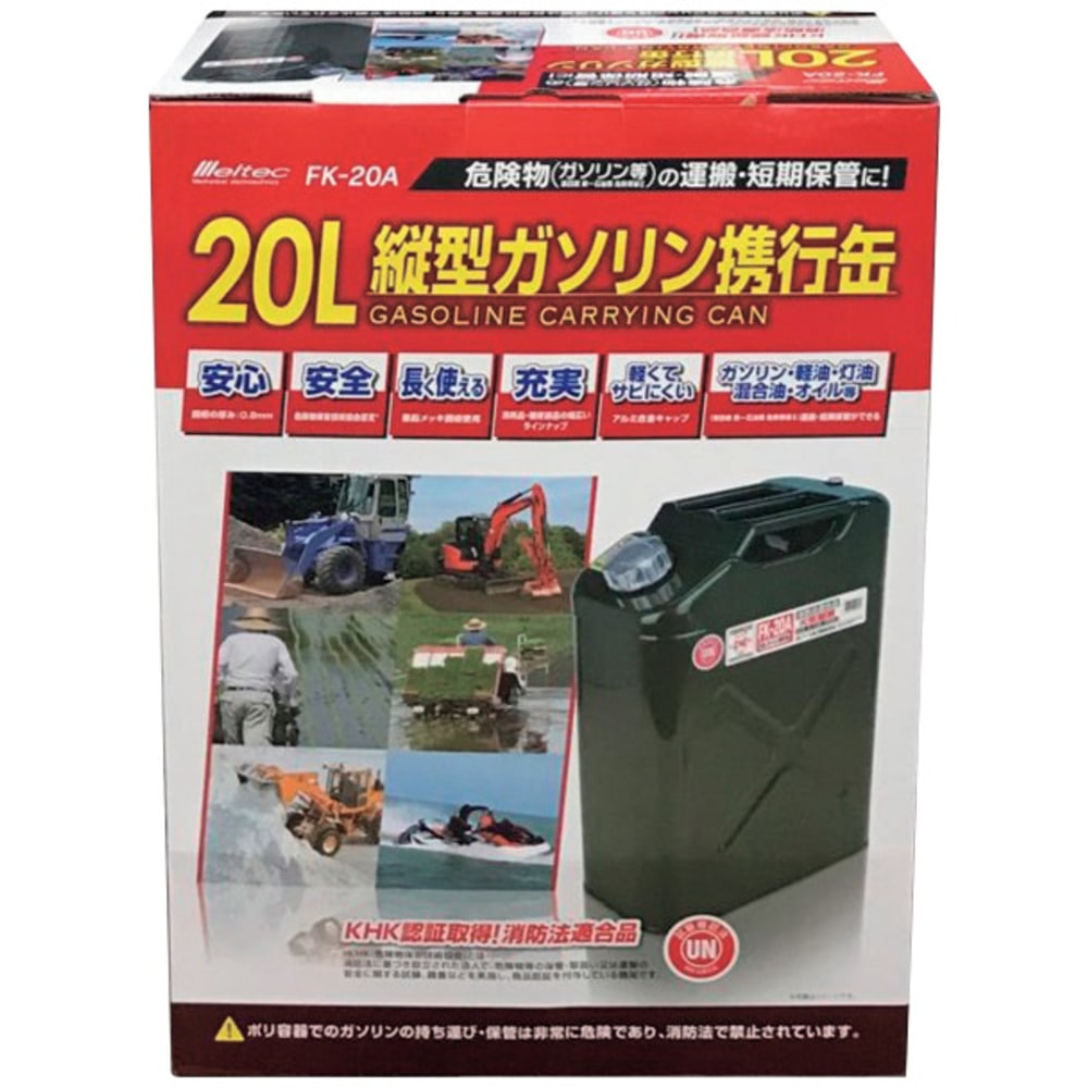 ●自動車・発電機・小型農機・除雪機などに最適です。●容量(L):20●幅(mm):345●奥行(mm):173●高さ(mm):469●ノズルサイズ(mm):355●色:緑●KHK規格●鉄板厚さ:0.8mm 質量3.8kg
