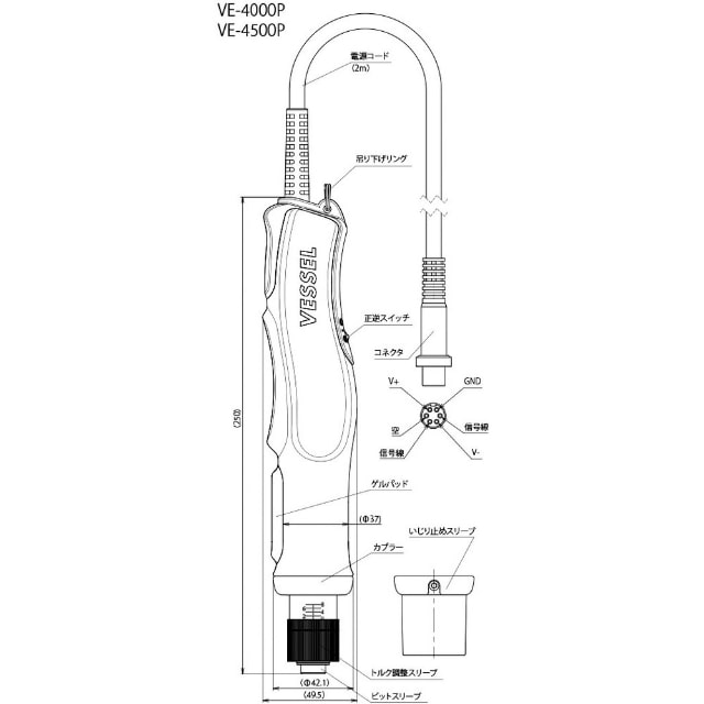 ●グリップは振動を吸収するゲルパッド付で持ちやすく、疲れにくくなっています。(エルゴノミックデザイン)●カーボンブラシの交換が不要でメンテナンスフリーです。●いじり止めスリーブ付で調整の誤操作を防ぎます。●ブラシレスモーター採用で長寿命かつ低騒音です。●モーターは、スロットレス構造でコギングがないスムーズな回転です。●両頭ビットが使えます。(VE-3000は除く)●出力トルク(N・m):0.3~1.5●無負荷回転速度(min[[の-1乗]]):HI:2000●適合ねじ(mm)小ねじ:M2.3~3.0●消費電力(W):DC32V 55●全長(mm):250●適合ねじ(mm)タッピンねじ:1.6~2.6●付属ビット:ベッセル B36 (+)1×70/(+)2×70 各1本●トルク調整リング:16段階×8目盛 質量700g