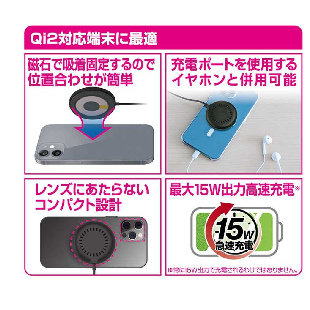 ●MagSafe対応iPhoneシリーズなどにマグネットで固定して、充電できるワイヤレス充電器。 ●磁石によりコイル位置が合うので、MagSafe対応iPhoneを効率よく充電可能。 ●iPhone、ワイヤレス充電対応のスマートフォンで最大出力15W充電可能。 (急速充電には対応機器とPower DeliveryのUSB電源が必要です。) ●端末の充電ポートを塞がないため、充電しながら有線イヤホンを使用することもできる。 ●置くだけで高速充電。iPhoneにケースをつけたまま充電可能。 ●排熱孔搭載。 ●安全・安心の保護機能付き。短絡保護、過電流保護、過電圧保護、異物検知搭載。 ●本体部難燃・耐熱材採用。