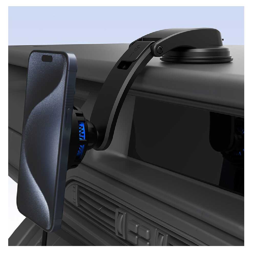 ●ネオジム磁石を16個内蔵し、MagSafe対応のiPhoneおよびMagSafe対応ケースをご使用のiPhoneを簡単に吸着・ホールド。 ●3重冷却構造、充電しながら放熱可能。 (充電器表面に強化ガラス採用、ペルチェ素子内蔵、超静音冷却ファン付き。) ●虹色LED付きの冷却ファンとペルチェ素子は充電開始時に自動起動。 (スマートフォンを取り外して約25秒後に自動停止。) ●最大15Wの急速充電対応。 (急速充電には対応機器と定格9V3AのUSB電源が必要です。) ●通電状況が分かるLED付き。 (緑色点灯:本体通電中/青色点灯:充電時/緑青色点滅:異常時) ●ローポジションタイプの吸盤式マウントパーツ。 運転中の視界を妨げにくい低位置へ設置。上下角度調節も可能。 ●ボールジョイント採用。 取り付け後も360°見やすい位置に角度調整が可能。 ●ねじ込み式のクリップでエアコンフィンにガッチリ固定。 ●サポートアームでしっかり支えることで、ホルダーが前に傾かない。 ●USB電源ケーブル付き。 ※本製品以外には使用しないでください。 ●安全・安心の保護機能付き。 過電流保護、過電圧保護、過熱保護、異物検知保護。