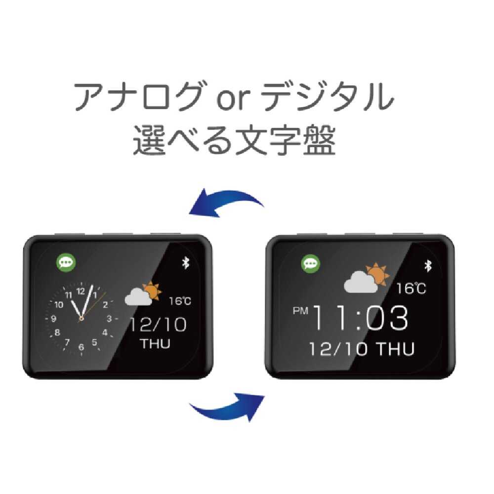 ●スマホと同期して正確な時刻を表示。 ●時間・日付・曜日(英語)・天気を常に同時に表示。 ※12時間/24時間切替可 ●電話の着信・SMS・天気・メール・SNSのプッシュ通知を表示します。 ※受信したメッセージは最大8件保存されます。 ※対応SNS(Line/Instagram/X/Facebook/WeChat/WhatsApp) ※画像や一部記号、絵文字は表示できません。 ※RCSの通知には対応していません。 ●デジタル時計・アナログ時計・プッシュ通知の切り替え可能。 ●USB-A電源+メモリ保持用CR2032ボタン電池。 ●金属ステー・両面テープ付属。