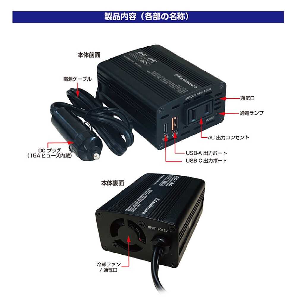 ●車のDC12VのDCソケットから家庭用AC100Vに変換できるインバーター。 ●定格/最大150WまでのAC100V機器(携帯電話・スマートフォン充電器、デジタルビデオカメラ、ポータブルDVDプレーヤー、ノートパソコン等)を車内で使用することができます。 ●最大24W出力のUSB-Aポート/最大24W出力のUSB-Cポート搭載。 ●USB端子とAC100V機器を同時に使用することができます。 ●手元に届き、車内の取り回しに便利なセパレートケーブル仕様。(コード長約70cm) ●通電時に緑色に光るLEDランプ付き。 ●放熱性に優れたアルミ筐体+冷却ファン内蔵。 ●各種保護回路機能付き。(過負荷出力保護・高電圧保護・低電圧保護・温度保護)
