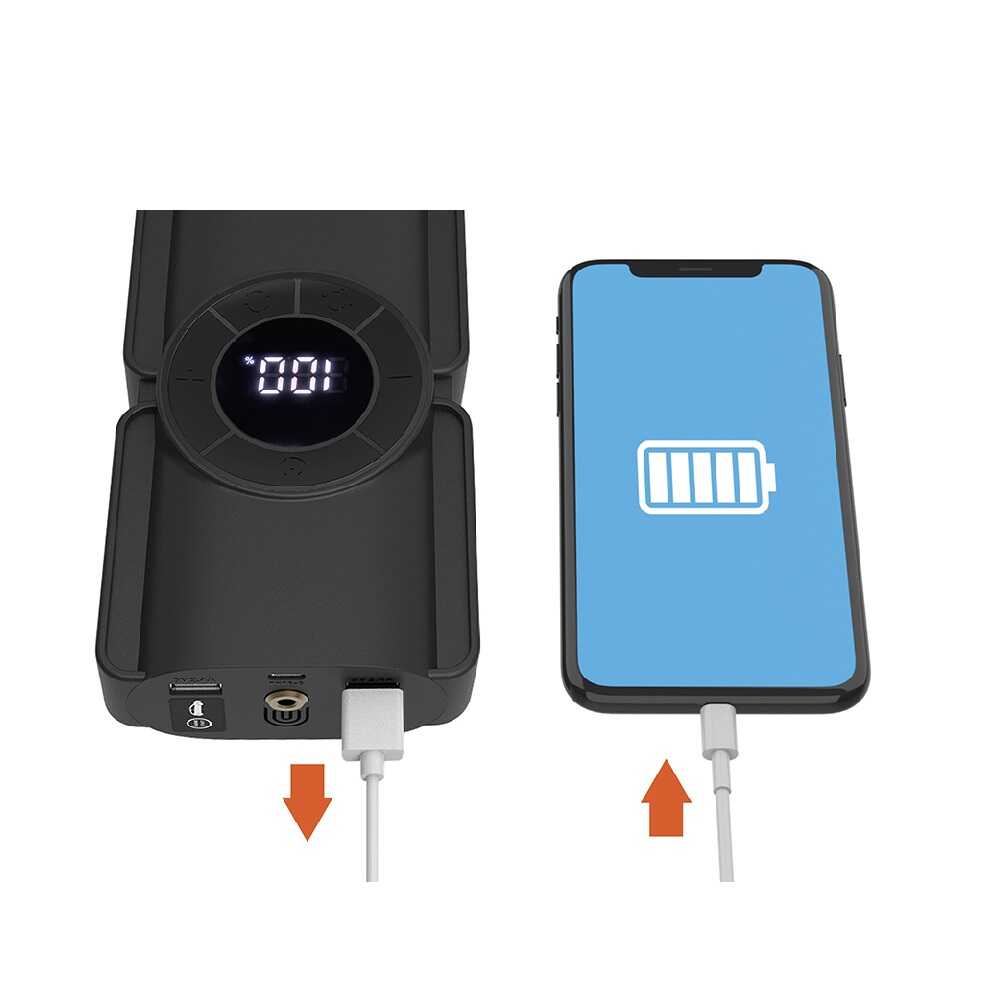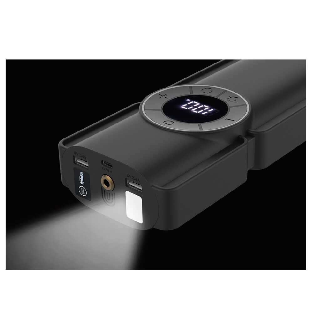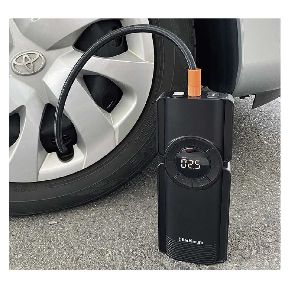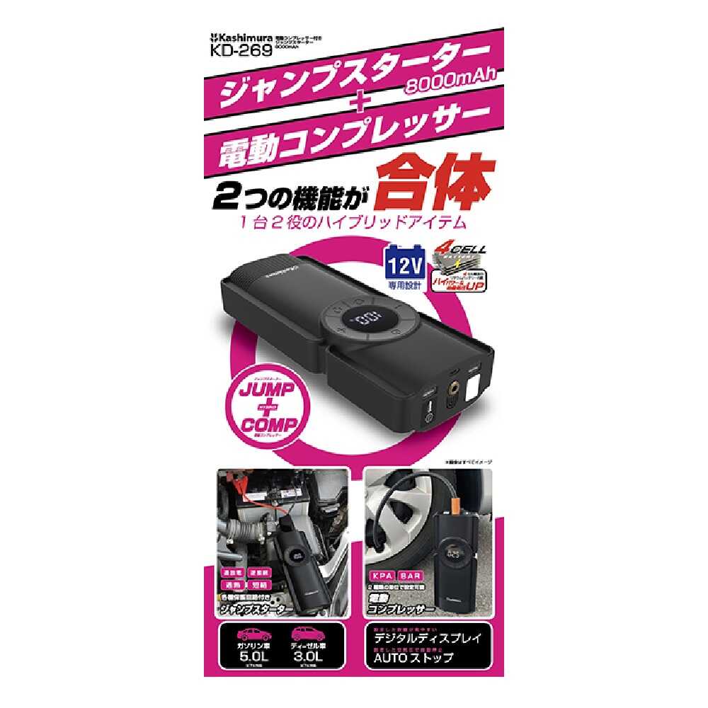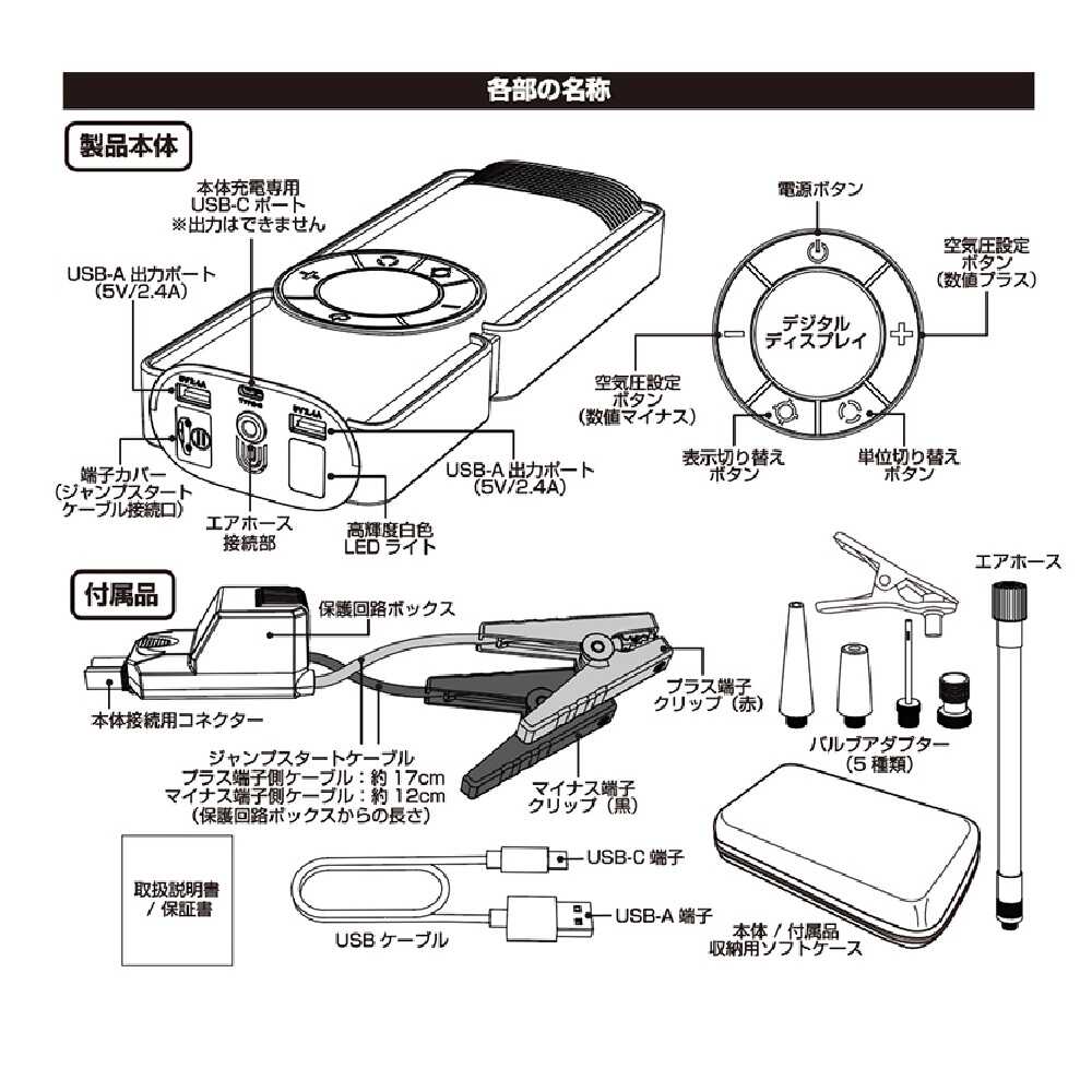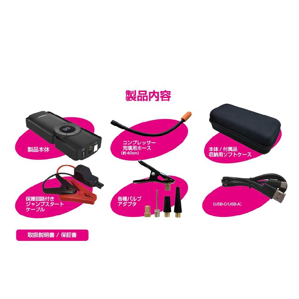 ●DC12V鉛バッテリー搭載の自動車やバイクのバッテリー上がりの際のエンジン始動を補助するジャンプスタート機能内蔵。 ●ガソリン車5.0L / ディーゼル車3.0Lまで対応。 ●4セル構造の8000mAhリチウムバッテリー内蔵。 ●保護回路ボックス付きジャンプスタートケーブルを付属。 ●リチウムイオン電池で動作する小型の空気充填用コンプレッサー搭載。 ●バッテリー残量や空気圧数値が見やすいデジタルディスプレイ採用。暗い場所でも見やすい白色文字発光。 ●指定空気圧の設定が可能・自動停止機能付き。 ●空気圧をデジタル表示・各種空気圧単位への表示切り替えが可能。 ※空気圧表示単位:BAR、KPA ●自動車以外の空気入れとしても使用可能な各種アダプター付き。(5種類) *プラスチックノズル(大)・・・ビニールプールなど *プラスチックノズル(小)・・・うきわなど *ボール用空気針 *仏式バルブ用 *英式バルブ用 ●モバイルバッテリーとして使用可能な定格2.4A出力のUSBポートを内蔵。スマートフォンやデジタル機器の充電が可能。 2ポート合計出力2.4A ●暗い場所や夜間の作業に便利なホワイトLEDを内蔵。非常時に役立つストロボ・SOS点滅への切り替えも可能。 ●本体充電用ケーブルを付属。 ●本体と付属品をまとめて収納可能なソフトケース付き。