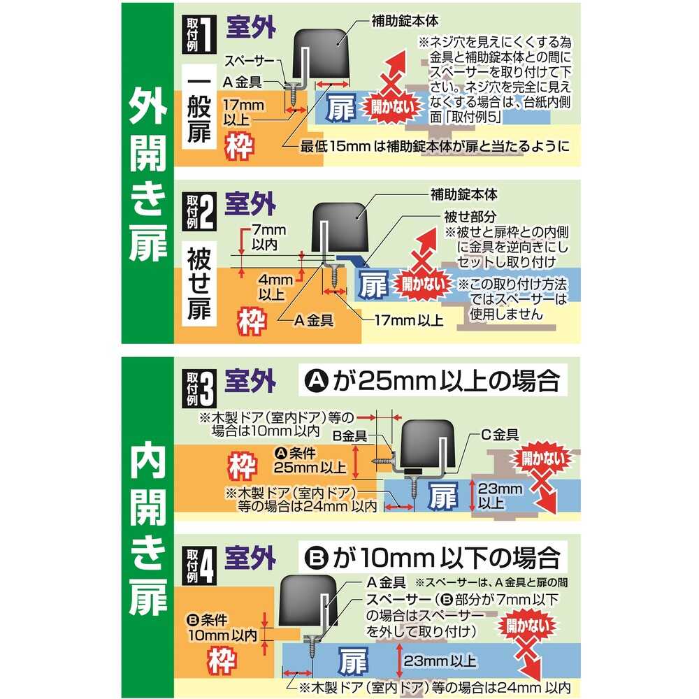 ●補助錠本体:アルミダイカスト(塗装仕上)、ディンプルキ―:真鍮(ニッケルメッキ仕上)、スペーサー:ステンレス、取付金具:ステンレス、取付ネジ:ステンレス