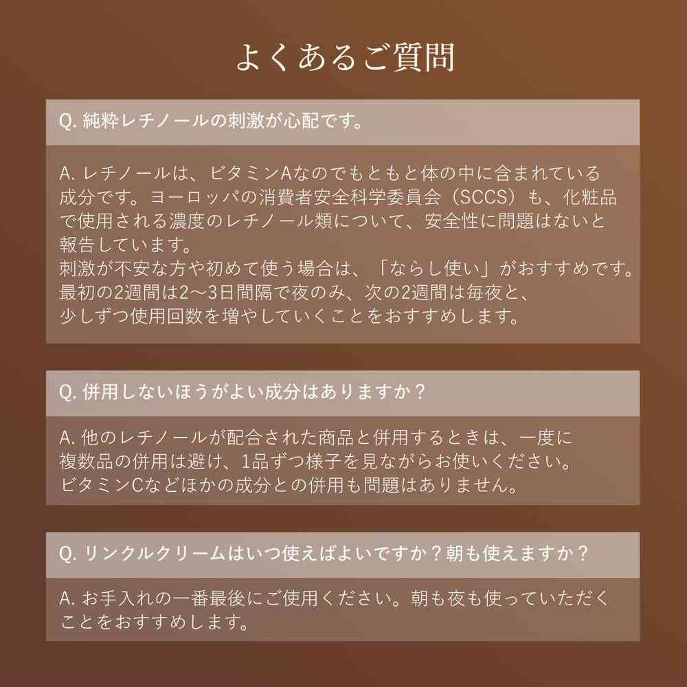 ◇直射日光にあたってお肌に異常があらわれたときには、ご使用をおやめください。◇目の中に入らないようご注意ください。◇ご使用後はチューブ容器の口もとをきれいに拭き、キャップをきちんと閉めてください。◇つけかえ用への交換時以外は中栓の根もとを引き上げないでください。◇日のあたるところや高温多湿のところに置かないでください。◇乳幼児の手の届かないところに置いてください。◇つけかえ用(別売り)があります。つけかえ用(別売り)をご購入の際は、本体のキャップ・中栓は捨てないでください。※これまでレチノール類を含む商品でトラブルがあったかたや、皮ふトラブルを起こしやすいかたは、ご使用をお控えください。※初めて使用するときや肌が敏感なときは、最初の2週間は2~3日間隔で夜のみ、次の2週間は毎夜と、少しずつ使用量を増やすことをおすすめします。※他のレチノールが配合された商品と併用するときは、一度に複数品の併用は避け、1品ずつ様子を見ながらお使いください。※使用回数・使用量を守って正しくお使いください。※首への使用が初めての場合は、顔と同様に上記注意事項を守ってご使用ください。※顔でトラブルがあったかたは首へのご使用をお控えください。※トラブルが生じた場合は、その部位(顔、首)の使用を中止してください。