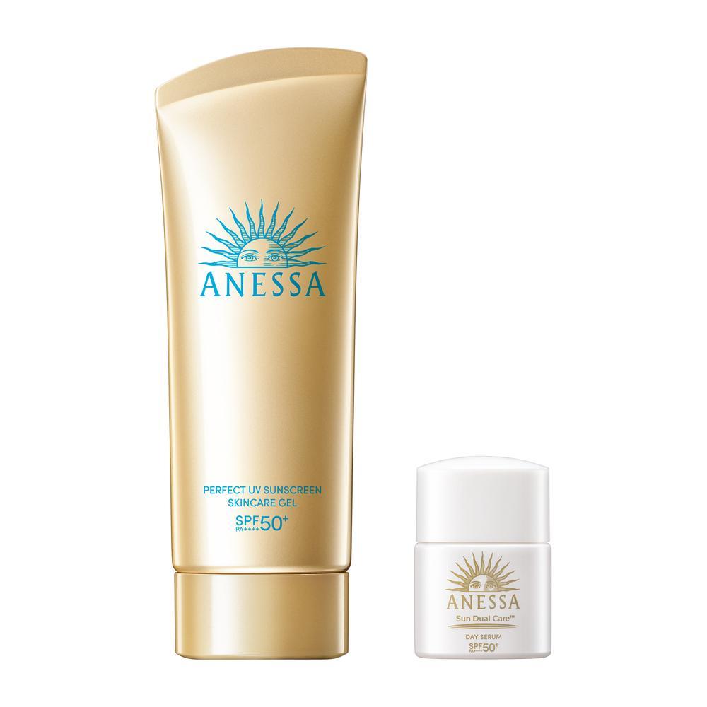 シミを防ぎながら、素肌まで美しく。うるおいを与え、素肌の保水力を整えるスキンケアUVジェル。 さらに、ハリ・うるおいに満ちた透明感のある肌へ導き、美白※ケア、トーンアップ仕上げまで叶える顔用UV美容乳液。限定セット。 ※メラニンの生成を抑え、シミ・そばかすを防ぐ [セット内容] ・アネッサ パーフェクトUV スキンケアジェル NA <日焼け止め用ジェル> 90g フルーティーフローラルの香り SPF50+ ・ PA++++ 顔・からだ用 ・アネッサ デイセラム N (医薬部外品) 日中用乳液・化粧下地 6mL フレッシュフローラルの香り SPF50+ ・ PA++++ 顔用