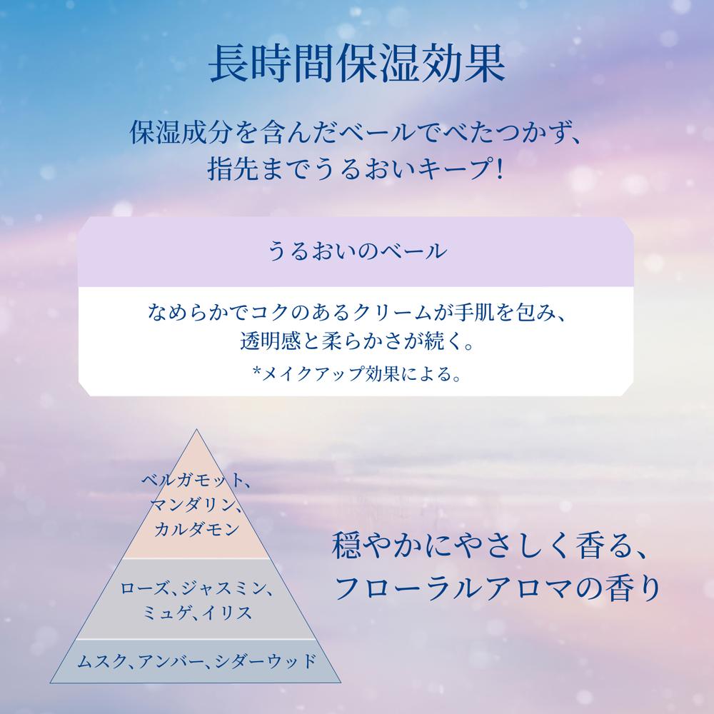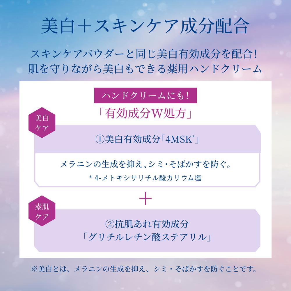 つけた瞬間、しっとりうるおって明るく美しい手肌を演出。薬用美白ハンドクリーム。 光拡散によるメイクアップ効果(ハンドビューティー効果)で、つけた瞬間からくすみをカバーし明るい手肌に仕上げ、保湿成分を含んだベールでコートするから、指先までうるおいが続く。 美白有効成分「4MSK」(4-メトキシサリチル酸カリウム塩)配合。 穏やかにやさしく香る、フローラルアロマの香り。 ※美白とは、メラニンの生成を抑え、シミ・そばかすを防ぐこと。 ●適量をとり、手の甲から指先に向かってなじませます。
