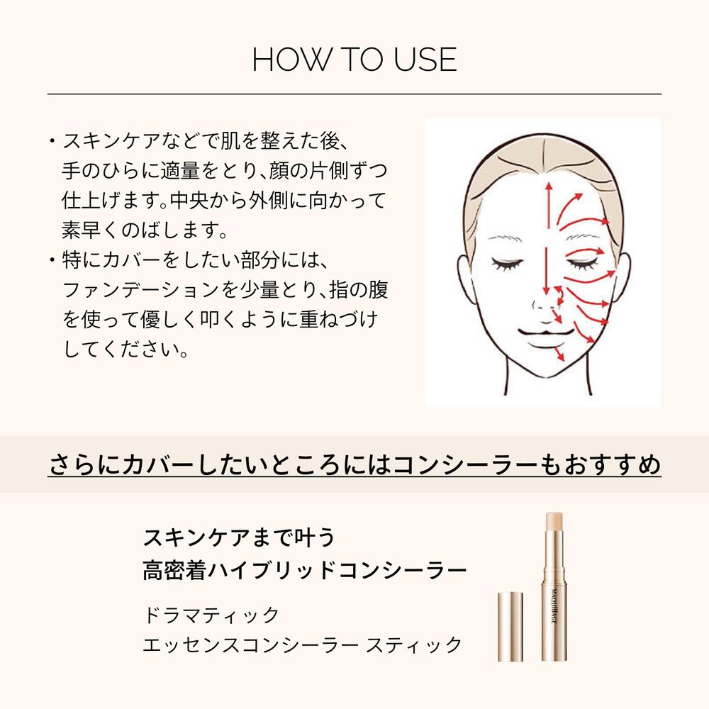 美容液でメイクする新発想で、使うたび、毛穴レスな「極上つるん肌」へ。 美容液でファンデ成分を包みこみ美容液が肌にずっとふれる独自技術「セラムファースト技術」を搭載した、ファンデ美容液。 毛穴や角層の奥までうるおいが届き、なめらかな肌へ。 毛穴・色ムラをしっかりカバーするのにみずみずしい使い心地。毛穴落ちが目立たず、1日中※つけたての美しい仕上がりが持続。 ※13時間 化粧もち ※※データ取得済み ※※毛穴の目立ちのなさ・毛穴落ちのなさ・つや・透明感・カバー力・よれのなさ・うすれのなさ・皮脂崩れのなさ (メーカー調べ。効果には個人差があります。) ≪ご使用について≫ ●スキンケアなどで肌を整えた後、手のひらに適量をとり、顔の片側ずつ仕上げます。中央から外側に向かって素早くのばします。 ●特にカバーをしたい部分には、ファンデーションを少量とり、指の腹を使って優しく叩くように重ねづけしてください。 ●使い始めは、中味が出るまでディスペンサーを数回押してください。 ●使用量が少ないと、十分な紫外線防御効果が得られません。 ●紫外線防御効果のある化粧下地などとの併用をおすすめします。