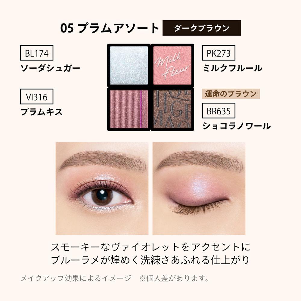 ◇目に入った場合は、こすらずに、すぐ洗い流してください。 ◇落下などの衝撃により、割れることがありますのでご注意ください。 ◇日のあたるところや高温・多湿のところに置かないでください。 ◇柔らかい中味のため、指先やチップで表面を強く押さないよう、ご注意ください。 <カスタマイズケースへのセット方法> 本品の透明ケース内の中皿を1色ずつそっと取り外し、セットしてください。その際、中味を削らないようにご注意ください。 <おすすめのご使用法> ●指先またはお手持ちのチップにとってご使用ください。 (1)右上の色:アイホール全体に広げます。 (2)左下の色:広くぼかしたり、目尻にポイントでいれて、ニュアンスを演出します。 (3)右下の色:運命のブラウンカラーをまぶたの際に沿ってのせて、ぼかします。 (4)左上の色:アイホール中心、下まぶた、目頭などにのせて輝きをプラスします。