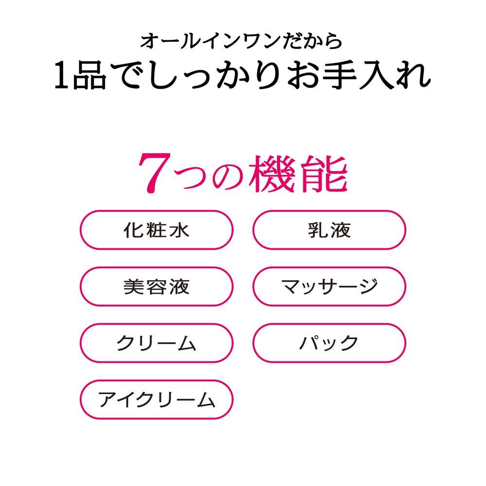 7つの機能(化粧水・乳液・美容液・マッサージ・クリーム・アイクリーム・パック)がひとつになった大人のオールインワン。 輝くゲル状クリームが、使った瞬間になめらかに密着し、つやっと輝く肌に導きます。 シワ改善&美白*有効成分ナイアシンアミド配合。 *美白とは、メラニンの生成を抑え、シミ・そばかすを防ぐこと。