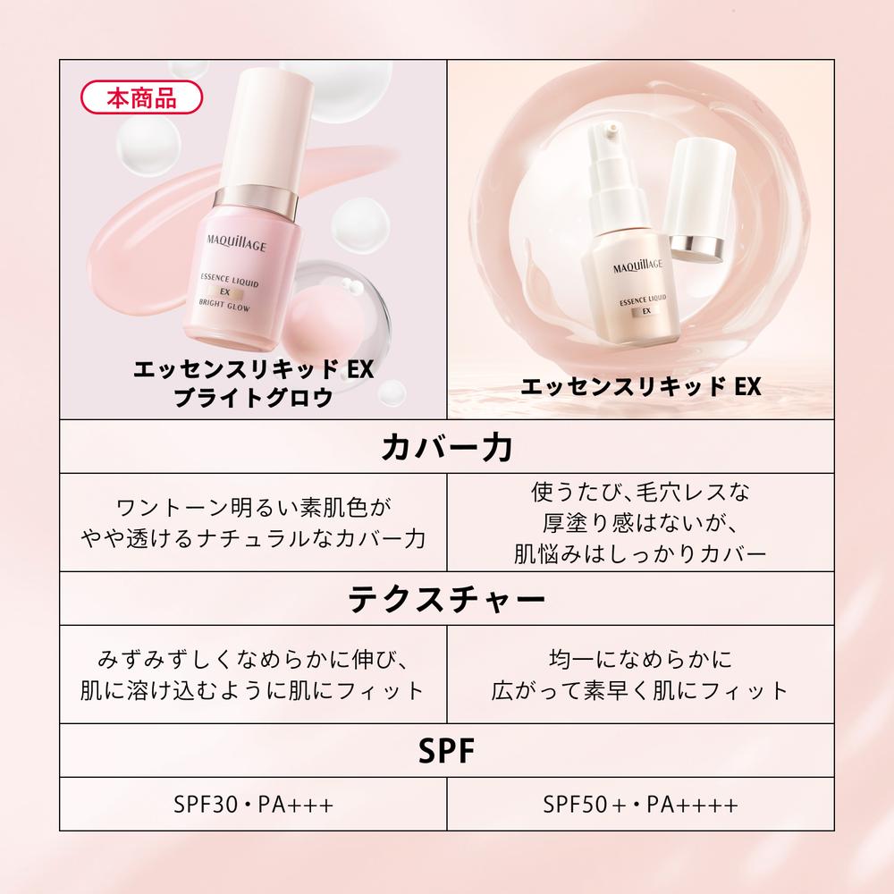 ◇中身が飛び散ることがありますので、手のひらにディスペンサーの先を近づけて、優しく押すようにお使いください。 ◇目に入らないよう注意し、入ったときはすぐに洗い流してください。 ◇ご使用後は容器の口もとをきれいに拭き、必ずカバーキャップをきちんと閉めてください。 ◇中身の品質を保つため、マキアージュエッセンスリキッドEXブライトグロウのディスペンサー以外は使用しないでください。 ◇中身衛生上、使用期間中はディスペンサーを容器から取り外さないでください。また、途中で開けると中身が出にくくなることがあります。 ◇衣服などについた場合は、すぐに洗剤でていねいに洗い流してください。 ◇ディスペンサーがスムーズに動かなくなったり、カバーキャップがきちんと閉まらなくなった場合は、新しい本体をお求めください。 ◇日のあたるところや高温・多湿のところに置かないでください。◇製品性質上、まれに透明の液体(エモリエント成分)が出ることがありますが、使用性や仕上がりに問題はありません。 ◇火気にご注意ください。 ※商品のSPF表示及びPA表示は、SPF試験法に定められている塗布量1cm2あたり2mgを皮ふに塗布して測定した結果です。