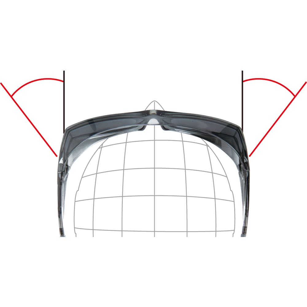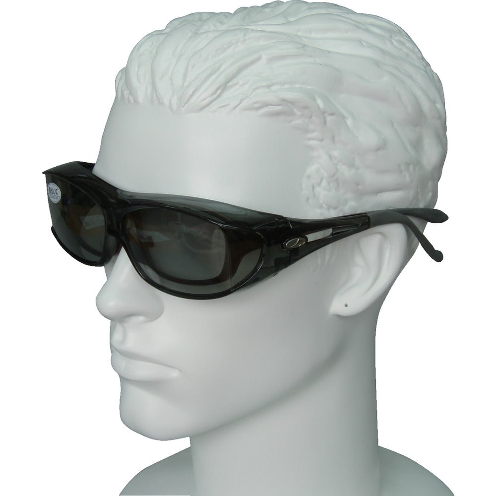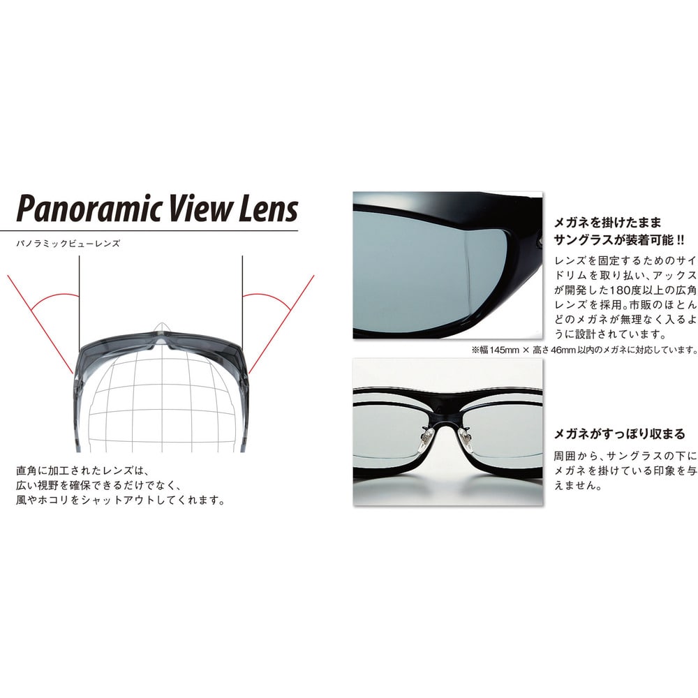 ●180度以上の視界が確保できるパノラミックビューレンズを搭載した、大型メガネの上からでも掛けられるオーバーグラスです。●レンズ色:スモーク●テンプル色:クリアスモーク●フレーム色:クリアスモーク●幅(mm):163●高さ(mm):50●レンズ厚(mm):1.0●可視光線透過率(%):34●紫外線透過率(%):0.1●UVカット率(%):99.9●UVカット:○●ツル調整:○●メガネ併用可否:○●全幅×高さ(mm):163×50●UV400プロテクション●偏光トリアセテートレンズ(TAC)●パノラミックビューレンズ●硬質ナイロンフレーム(TR90)●フレキシブルラバーテンプル●大型メガネ使用可 質量34g