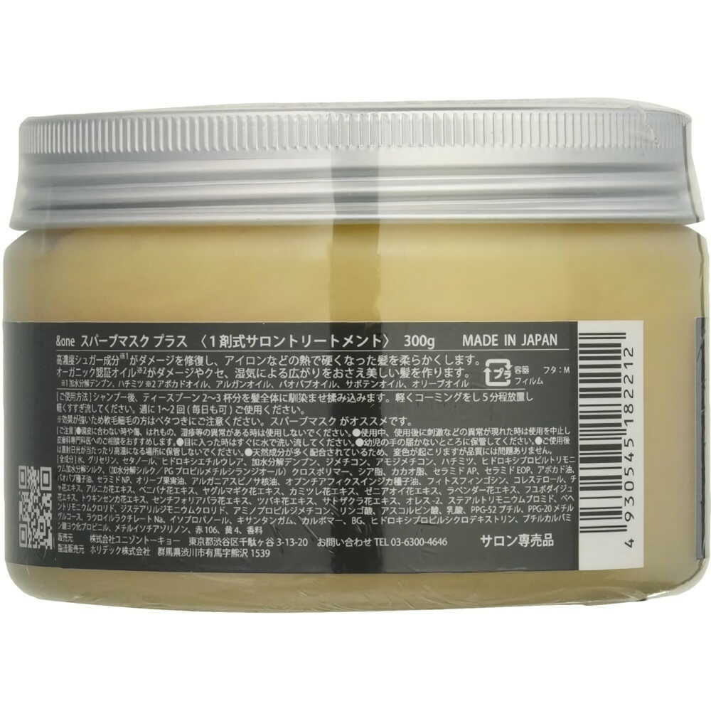 &ONEスパーブマスクプラスはスパーブマスクをより強力にしたトリートメントです。 カカオバター、シアバターを配合することで、硬毛や多毛にしなやかさを与え広がりやボリュームを抑えます。 重さ、持続力が強いタイプですので軟毛や細毛にご使用の際は、ベタつく可能性があるのでご注意ください。 効果が強すぎる場合はスパーブマスクがオススメです。