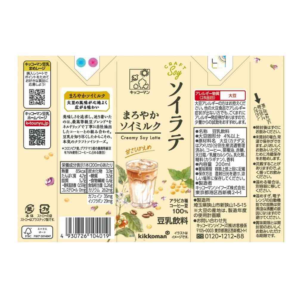 キッコーマン豆乳が作る自信作「クラフトソイシリーズ ソイラテ」。 できたての風味を活かした豆乳と、その豆乳に合うよう選定した最高等級豆ブレンド(※)をネルドリップで丁寧に自社抽出したコーヒーを組み合わせました。 (※)コロンビア産、グアテマラ産の最高等級豆を76%使用(コーヒーに占める割合)