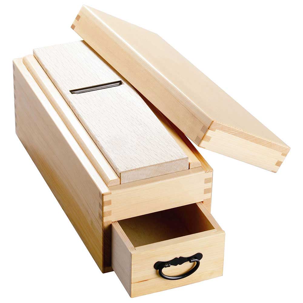 ●刃部:炭素鋼。 ●鉋台:樫。 ●箱(米松)・刃取付ベース(軟鋼)。