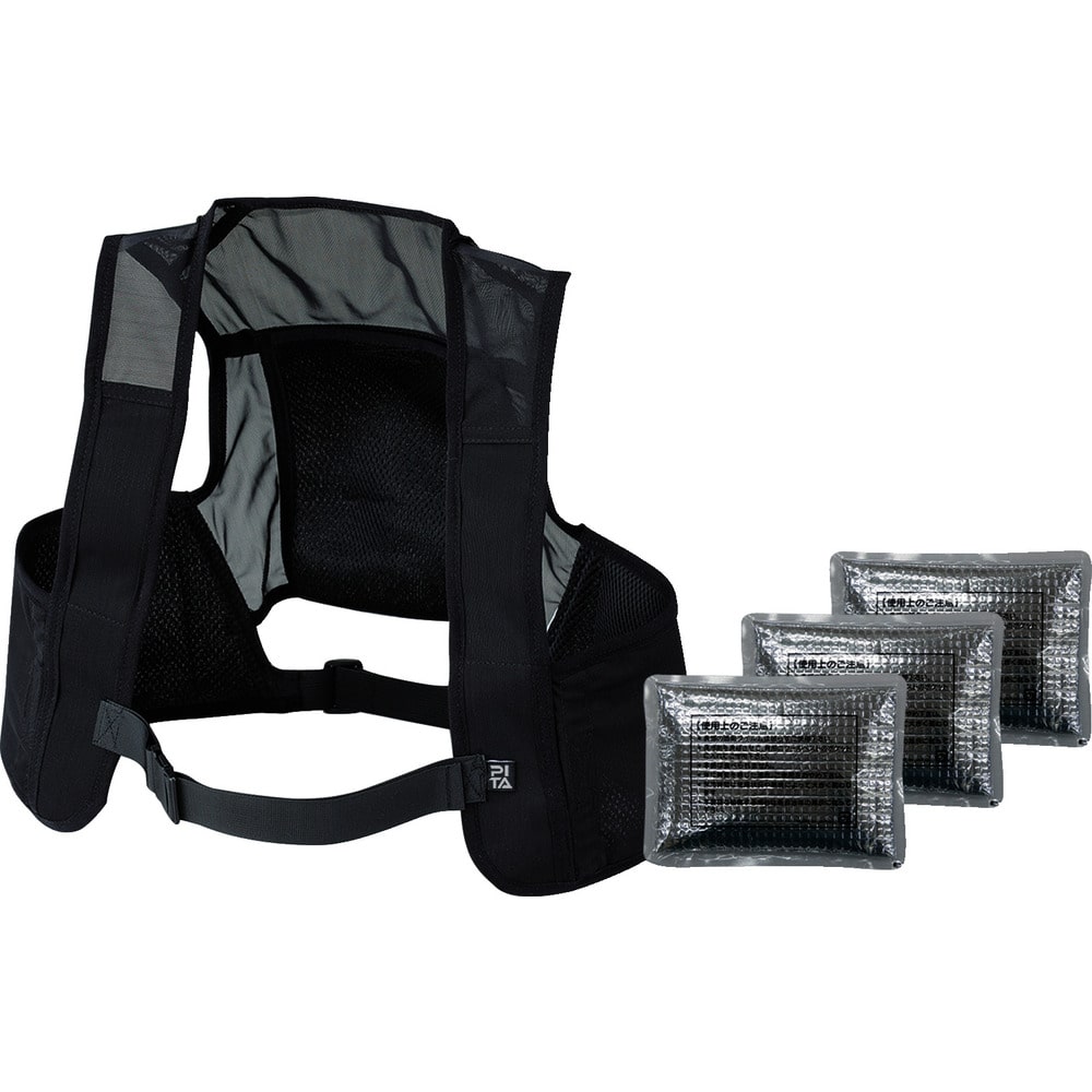 ●熱中症予防に効果的な「脇の下」と「背中」をピンポイントに冷却します。●伸縮性と通気性に優れたメッシュ生地により、体にフィットし作業の邪魔をしません。●着脱簡単なバックルにより体型に合わせたサイズ調整が可能です。●保冷剤ポケット内側の立体メッシュ構造により、冷えすぎ防止・冷却効果が持続します。●空調ファン付きウェアとの相性抜群、フルハーネスとの併用の可能です。●色:ブラック●サイズ:フリー●着丈(cm):32●胸囲(cm):85~115●冷却ファン有無:無●保冷剤用ポケット有無:有●付属保冷剤(個):3●胴回り(cm):約85~115●ベスト本体質量(g):106●保冷剤質量(g)(1個あたり):200●保冷剤サイズ(mm)(1個あたり):約133×約178×厚さ約15 質量706g