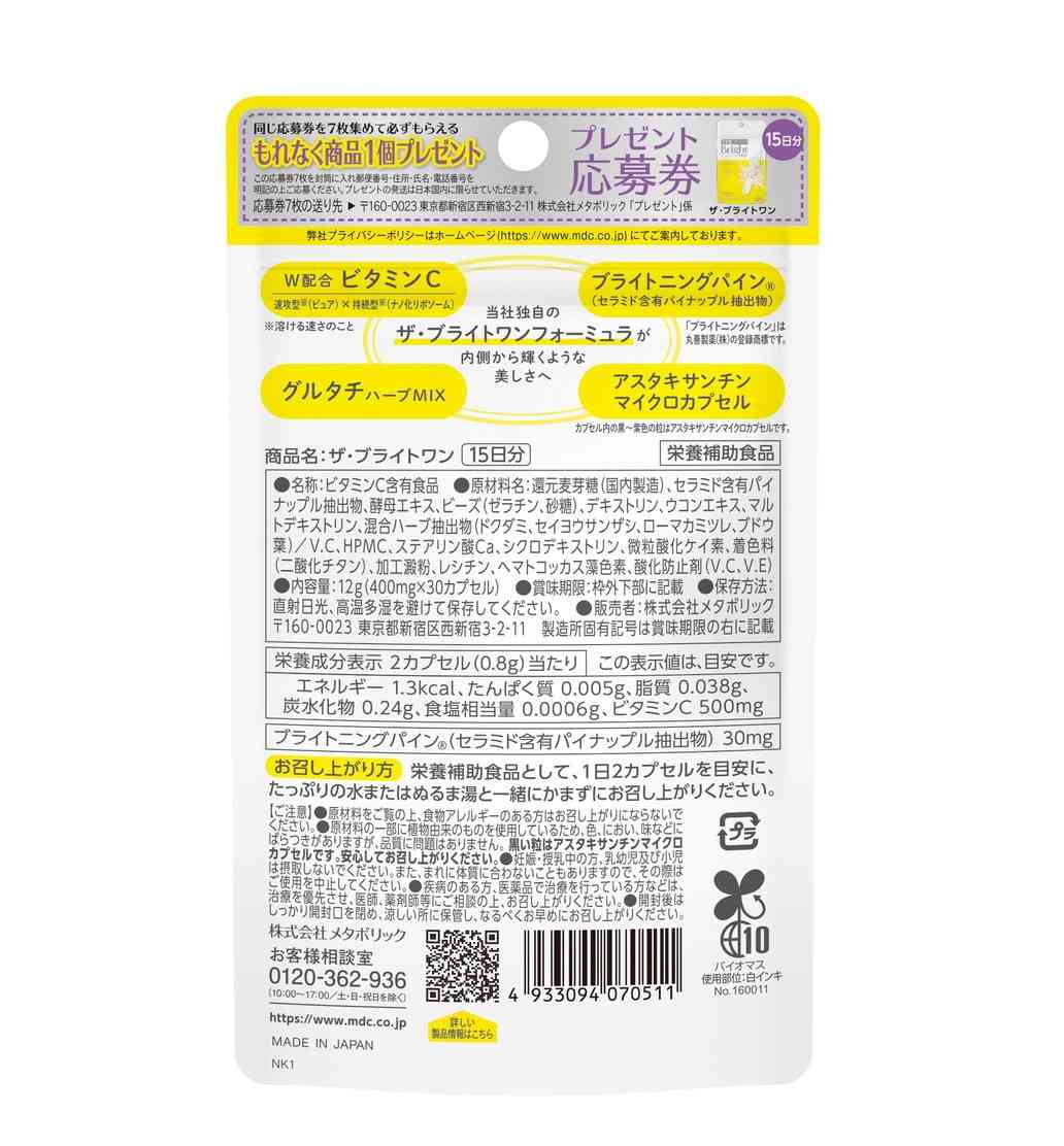 還元麦芽糖(国内製造)、セラミド含有パイナップル抽出物、酵母エキス、ビーズ(ゼラチン、砂糖)、デキストリン、ウコンエキス、マルトデキストリン、混合ハーブ抽出物(ドクダミ、セイヨウサンザシ、ローマカミツレ、ブドウ葉)/V.C、HPMC、ステアリン酸Ca、シクロデキストリン、微粒酸化ケイ素、着色料(二酸化チタン)、加工澱粉、レシチン、ヘマトコッカス藻色素、酸化防止剤(V.C、V.E) 2カプセル(0.8g)当たり ブライトニングパイン※(セラミド含有パイナップル抽出物) 30mg ※「ブライトニングパイン」は丸善製薬(株)の登録商標です。 エネルギー 1.3kcal、たんぱく質 0.005g、脂質 0.038g、炭水化物 0.24g、食塩相当量 0.0006g、ビタミンC 500mg