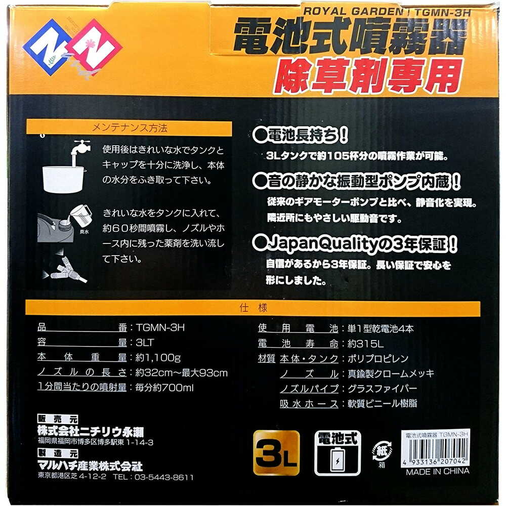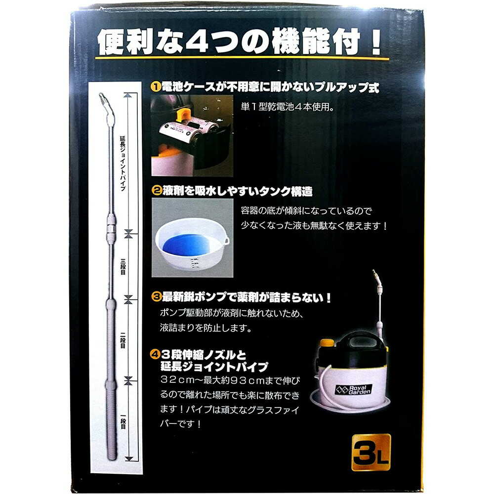 液詰まらないポンプを利用 【特徴】 ・電池長持ち ・音の静かな振動型ポンプ内臓。 ・単1電池4本使用 ・1分間噴霧量:約700ml/分 ・1分間直射:約700ml/分 ・作業時間目安:約7時間半 ・電池寿命:約315L ・ノズルの長さ:約32~93cm