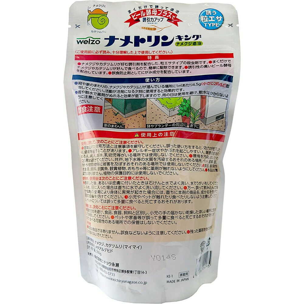 まくだけで誘って退治 【特徴】 ・ナメクジやカタツムリが好む誘引剤を配合した、粒エサタイプの殺虫剤です ・まくだけでナメクジやカタツムリが好んで食べるので、簡単に退治出来ます ・誘引性の高いビール酵母を配合しいます ・誤食防止剤剤としてにがみ成分を配合しています