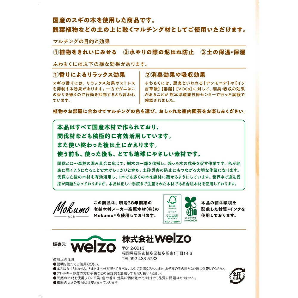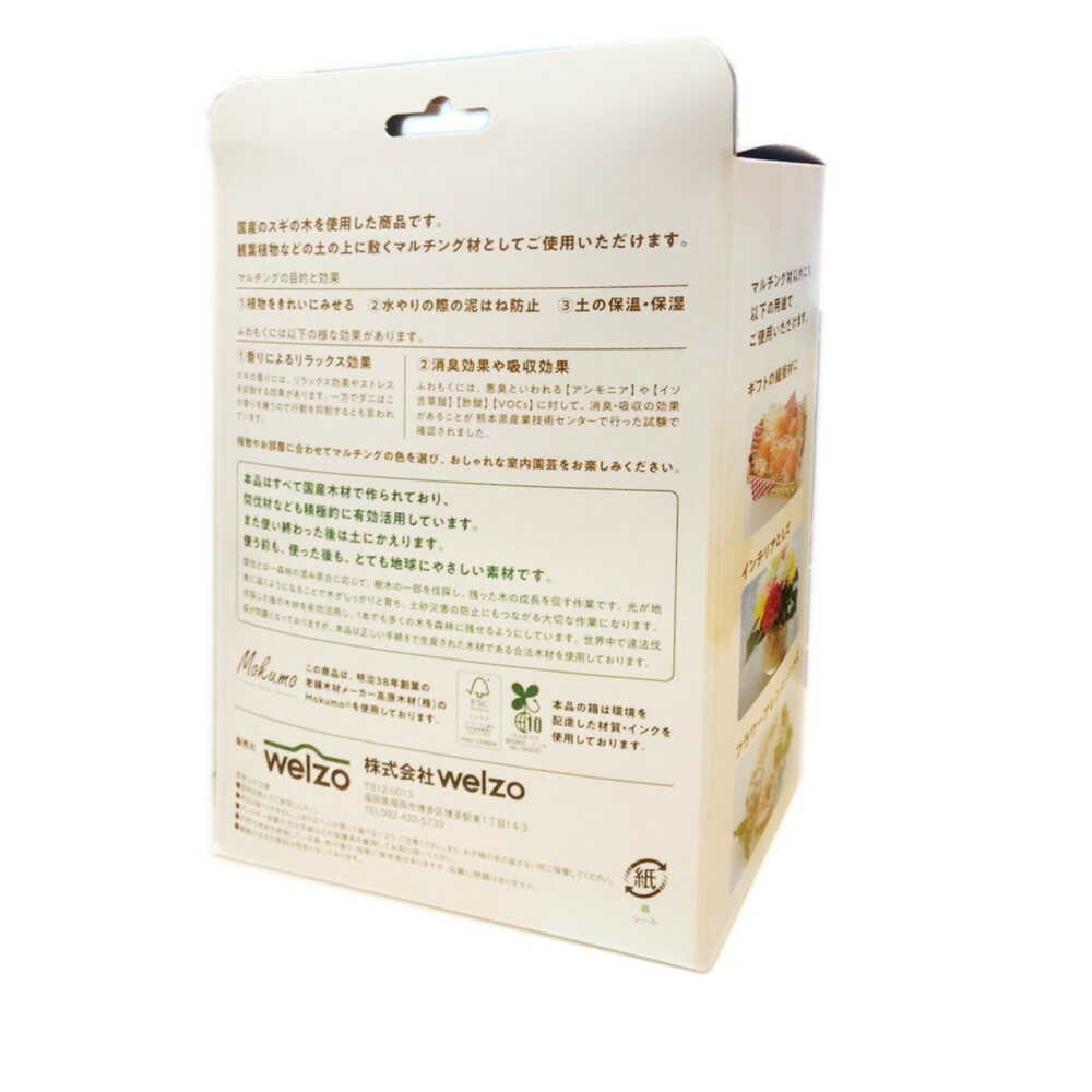 100%国産天然素材で作られており、間伐材なども積極的に有効活用しております。また使い終わった後は土にかえります。使う前も、使った後も、とても地球にやさしい素材です。 【特徴】 100%国産天然素材で観葉植物などのマルチング材としてご使用いただけます。 マルチング材以外にもギフトの緩衝材・インテリア・フラワーアレンジメントなどにご使用いただけます。