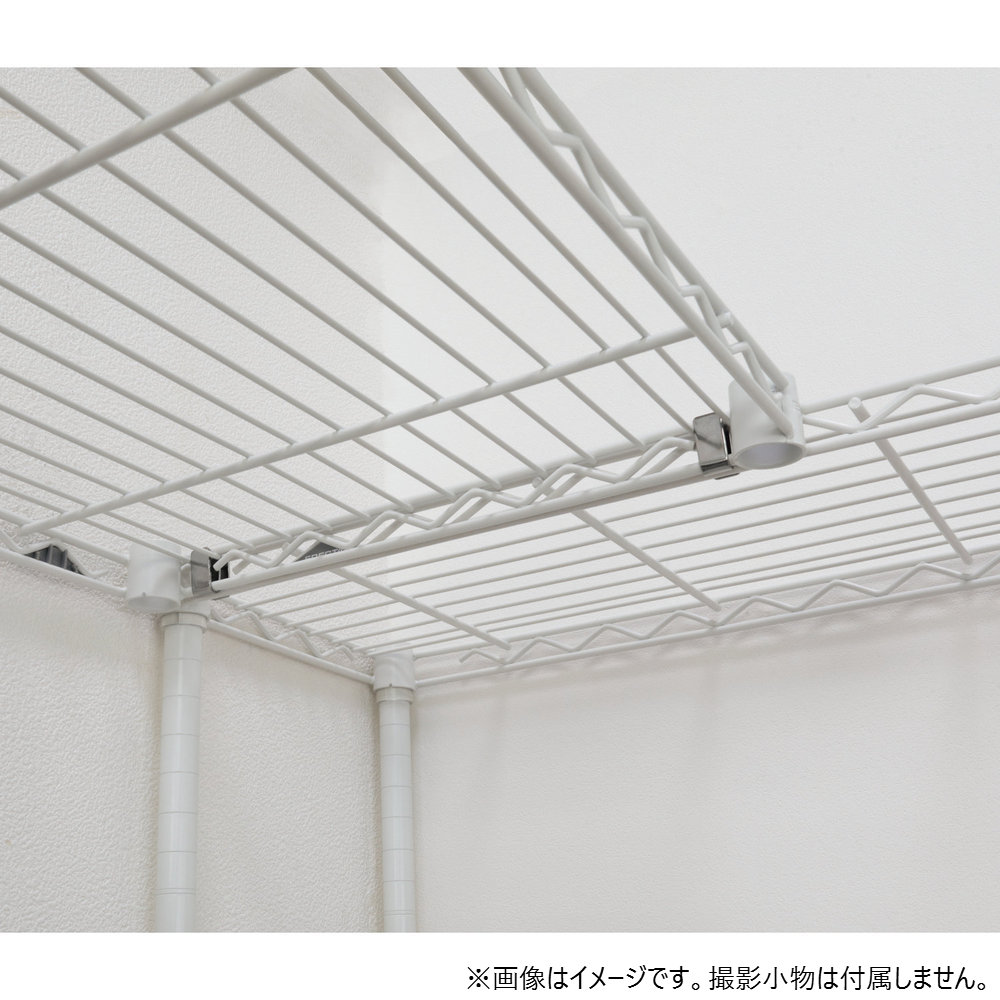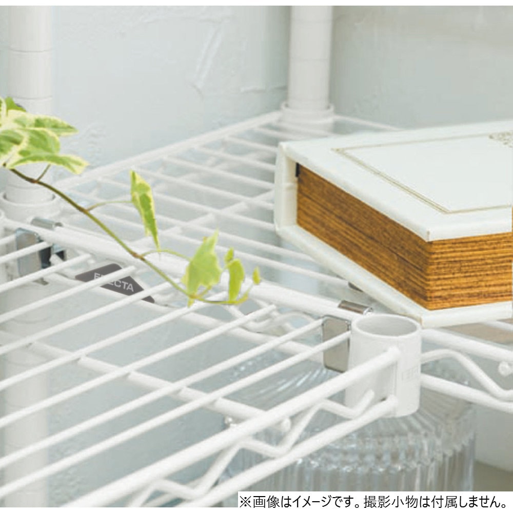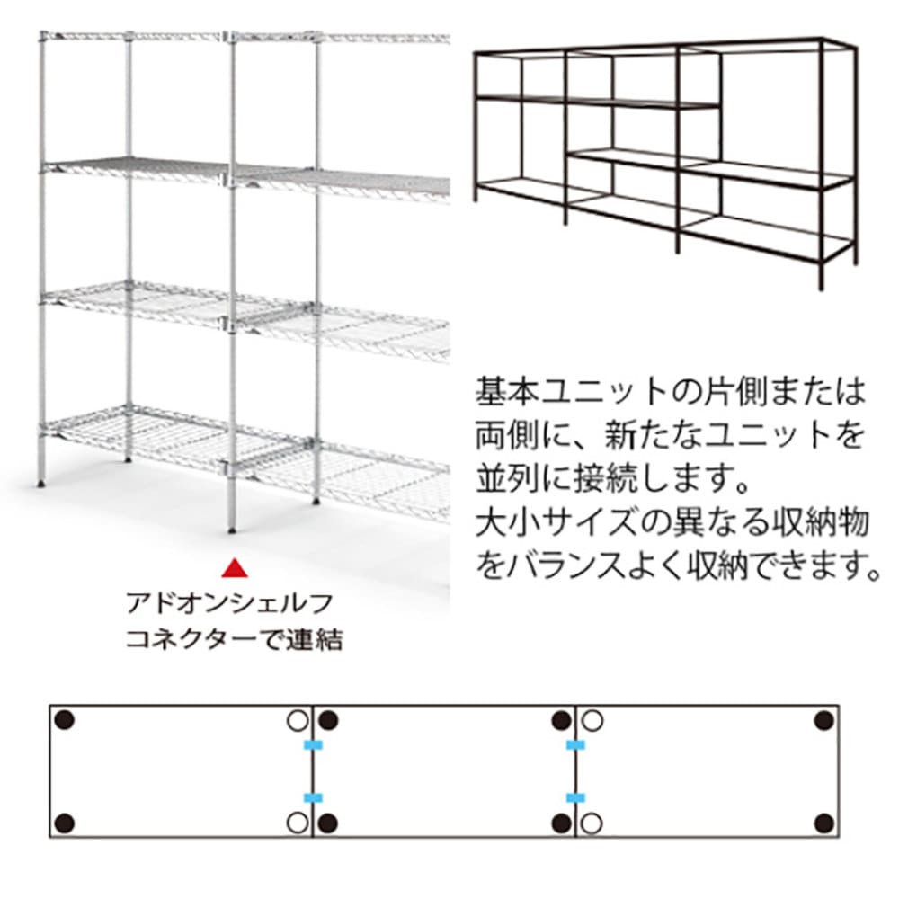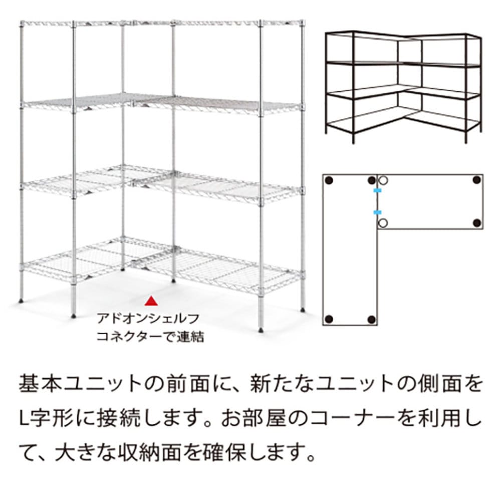 ワイヤーシェルフ同士の連結パーツ。直線タイプ、L字タイプ、どちらにも活用でき、ポールの節約にもつながります。コネクターを連結しても、ワイヤー1枚あたりの耐荷重は変更ありません。