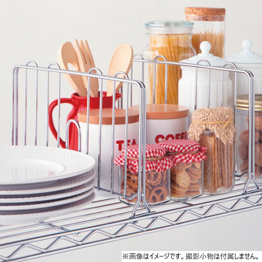間仕切り収納に、小物の転倒防止に。小物の整理や転倒防止に便利なブックエンド型のパーツです。ワイヤーシェルフの表裏どちらにも取り付けられるので、載せる物の形、大きさに合わせてご活用ください。