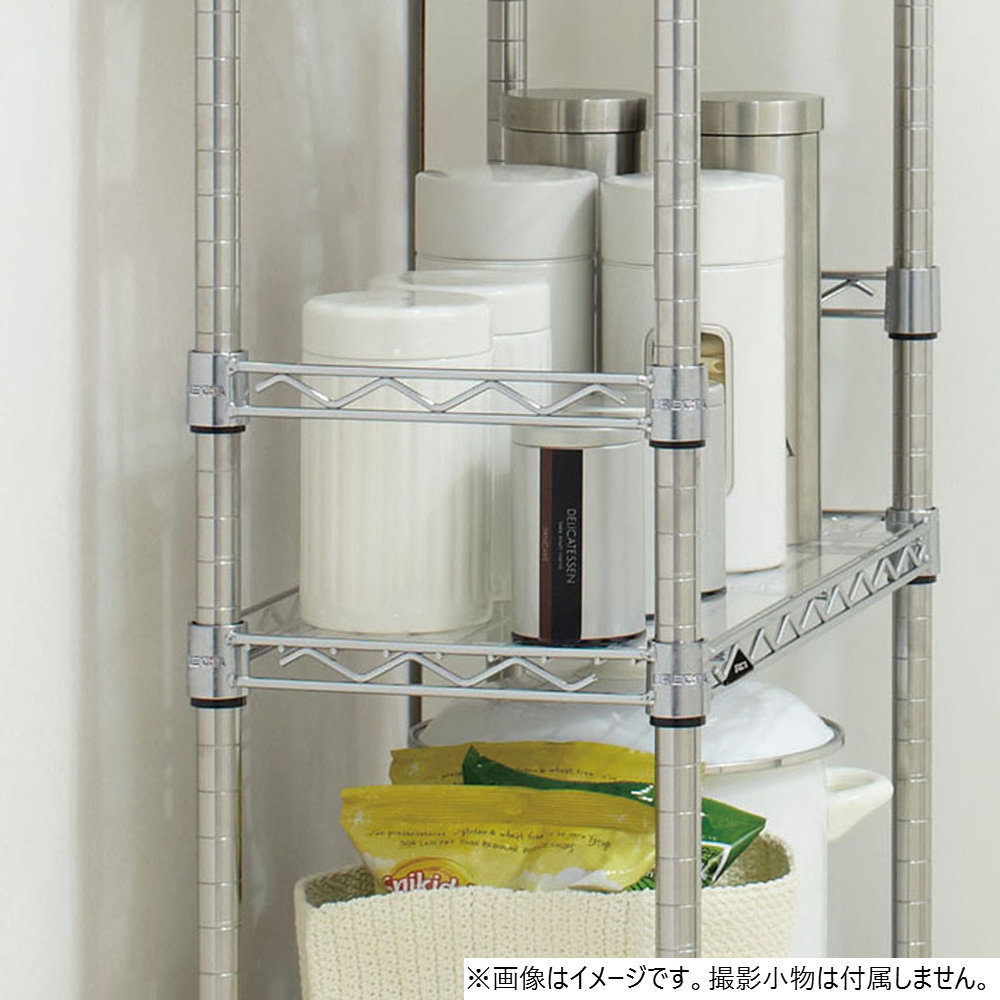 幅広い用途に使える便利なハンガーレール。小物を置いた時のこぼれ止め、フック用のレール、カートのハンドル、補強用としてなど、シェルフの奥行・間口方向に設置できる便利なパーツです。【仕様】耐荷重:20kg/棚1段 垂直荷重(等分布)●互換性:スーパーシリーズ等、他のシリーズとの互換性はありません。