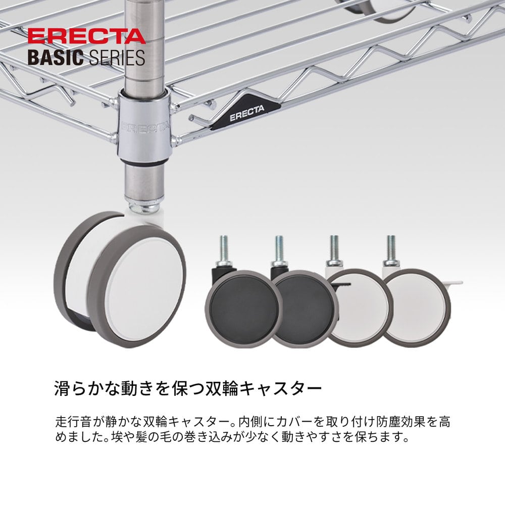 音も静かで床にやさしい双輪キャスター。キャスターの内側にカバーを取り付け防塵効果を高めました。埃や髪の毛の巻き込みが少なく動きやすさを保ちます。【仕様】総耐荷重:4個使用時/180kg(静止時)、120kg(可動時)●キャスター寸法:直径75mm・全高85mm・取り付け高さ62mm●エラストマーキャスターを使用した場合の最大外寸:間口・奥行寸法にキャスターのス トッパーなしは104mmを足した寸法になります。●付属品: 平ワッシャー、スプリングワッシャー、専用スパナ●互換性:スーパーシリーズ、ファーストシリーズ等、他のシリーズとの互換性はありません。