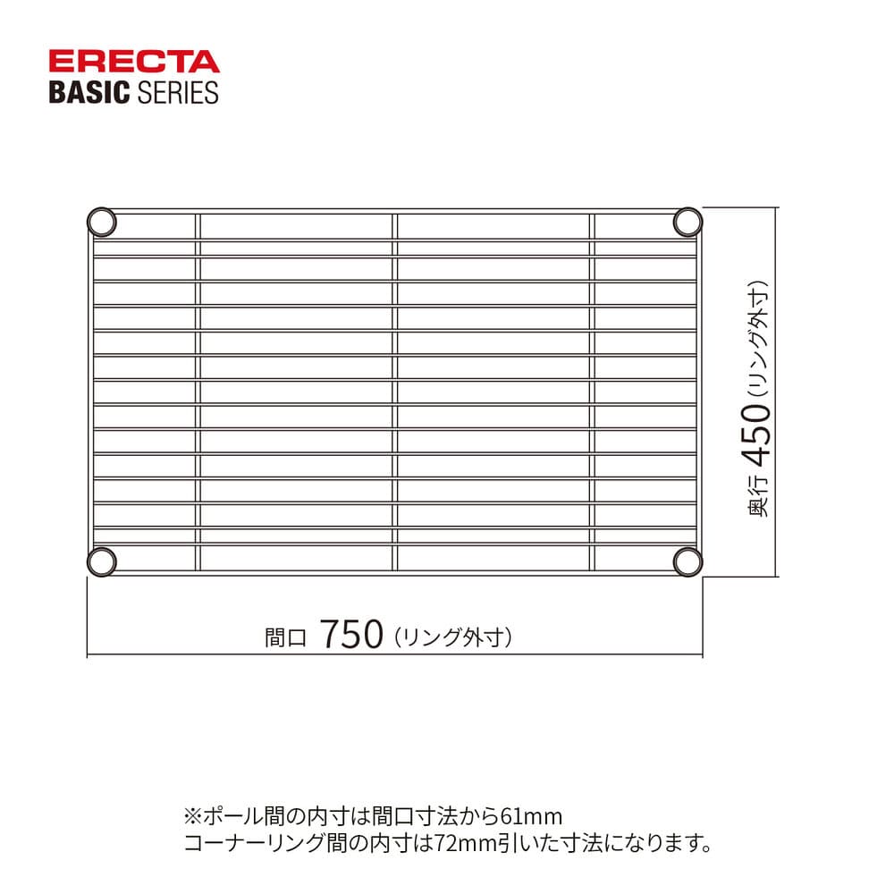 時代の変化にも揺るがないベーシックライン。高度な溶接技術により精度を高め、寸法安定性に優れます。 汎用性の高いパーツを用意し、万能型シェルフとして様々な用途に対応。棚1段あたり135kgの耐荷重。線材の切断面に面取り加工を施し、安全性に配慮。 間口1500mm、奥行450mm、600mmのワイヤーシェルフには補強用スネークが入ります。サビに強い仕上げ。クロームにはクリアコーティング仕上げを、ブラック・ホワイトにはエポキシコーティング仕上げ(粉体塗装)を施しているため、サビに強く衛生的です。【仕様】耐荷重:135kg/棚1段 垂直荷重(等分布)●互換性:同一サイズのユニット内で、下記の棚板との併用が可能です。・ベーシックシリーズ ウッドシェルフ・ベーシックシリーズ スライディングシェルフ/ 3 方クロスバー/アクリル板・ベーシックシリーズヴィンテージエディションスーパーシリーズ、ファーストシリーズ等、他のシリーズとの互換性はありません。
