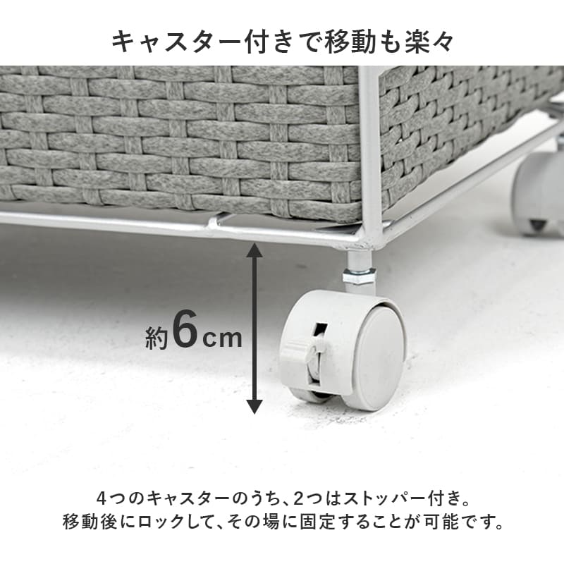 すっきりとした見た目のラタン調ランドリー収納。大きなかごは前に傾く設計で洗濯物の出し入れがしやすく、持ち運びにも便利な取っ手付き。
