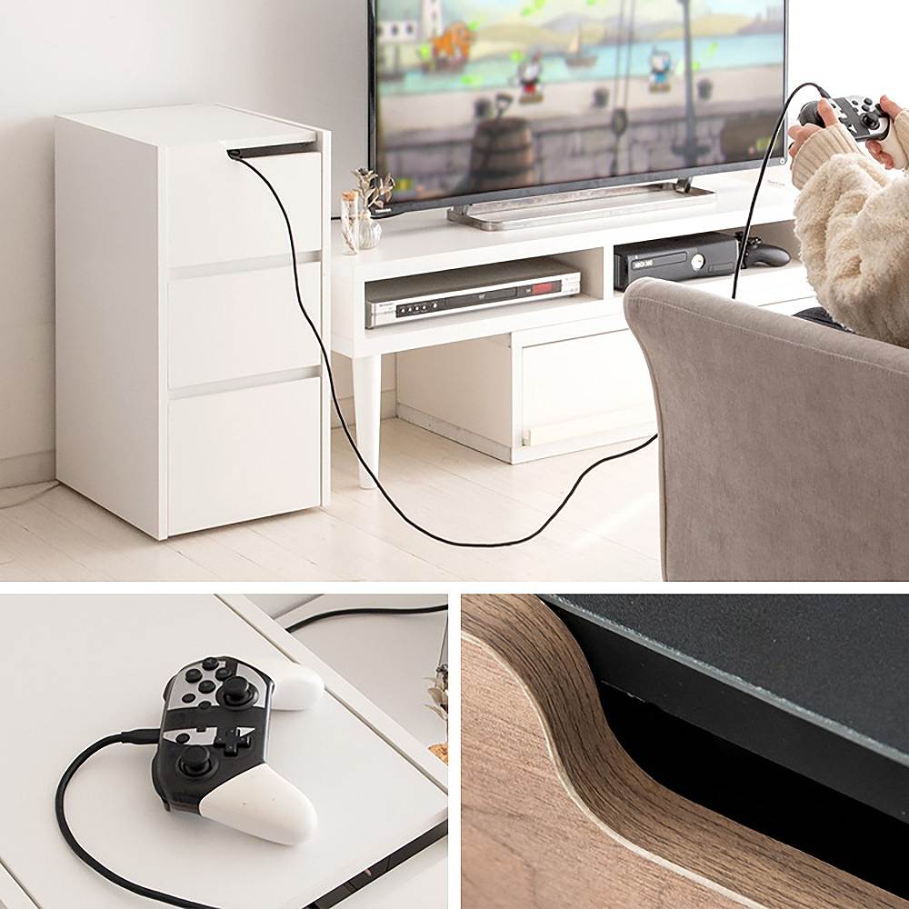 SwitchやSwitch2を3台とコントローラーやゲームソフトなどの周辺機器をまとめて収納できる便利なデザイナーズゲームワゴン『REGABO(レガボ)』。インテリアから浮いてしまうSwitchを3台分充電スタンドごと入れられるので、複数台お持ちのご家庭でも、お部屋の雰囲気を損ねることなくおしゃれな空間を演出します。背面オープン仕様で放熱対策もバッチリ。容量のある引き出し付きで周辺機器もスッキリ収納できます。製品重量:15kg 組立式(約40分)