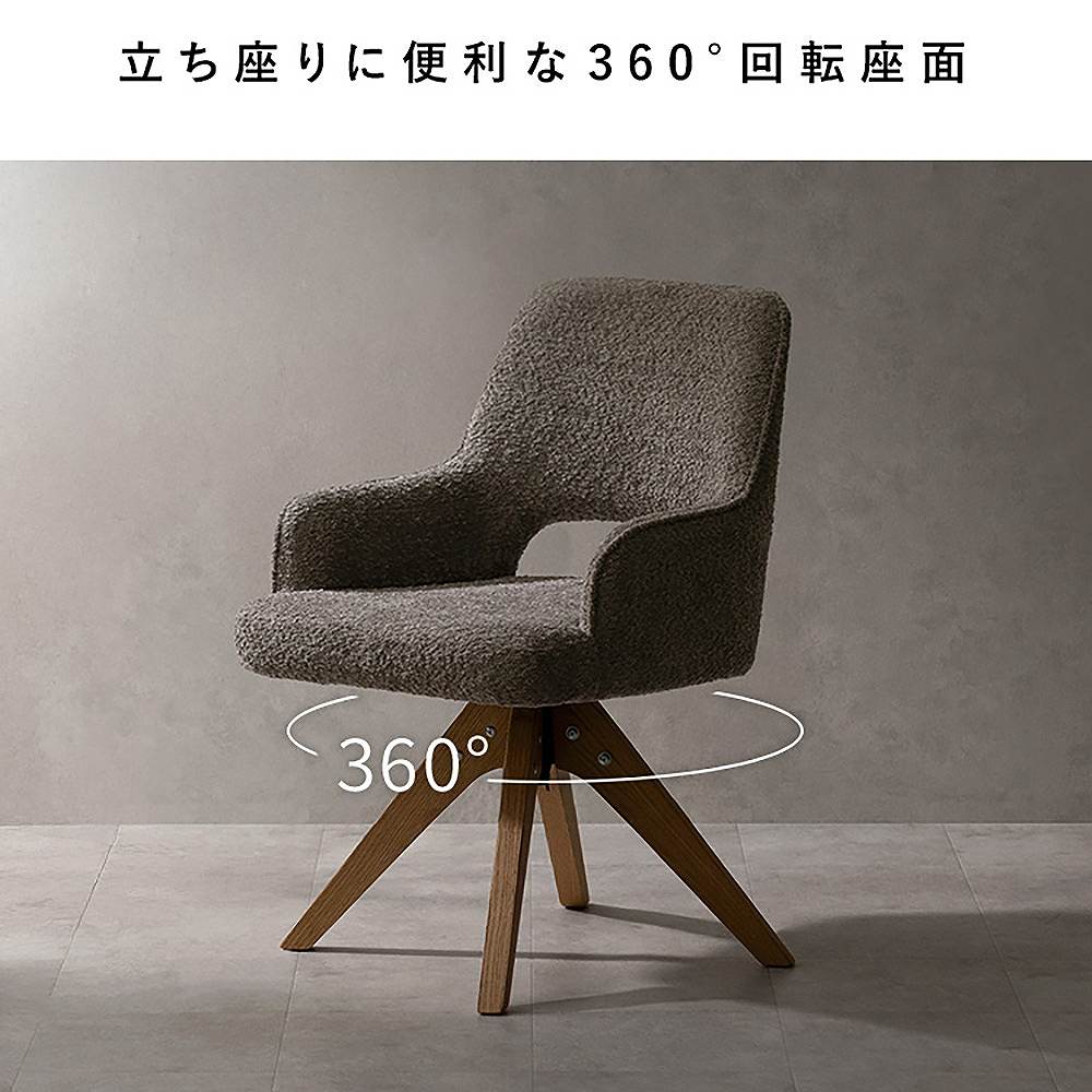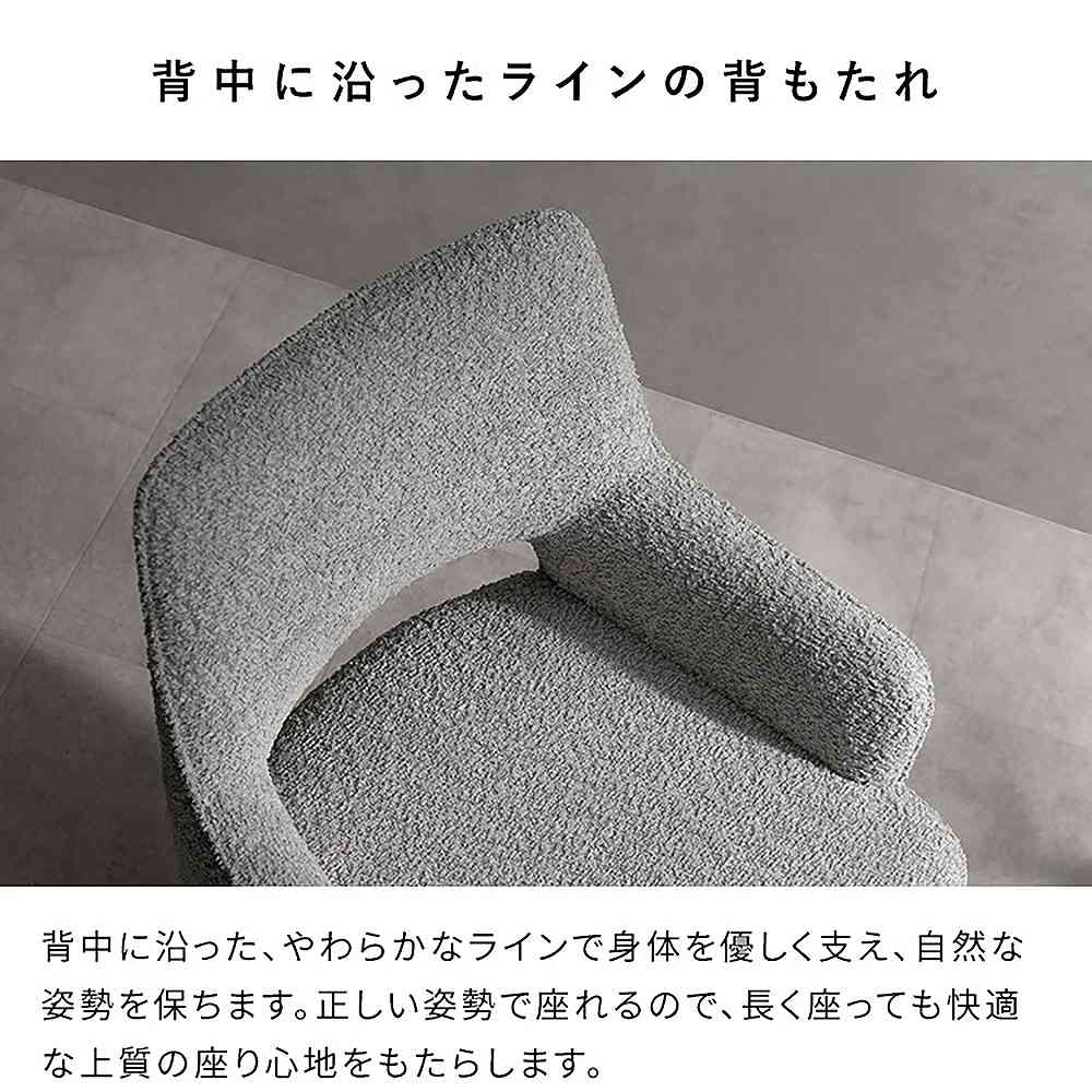 曲線と直線のバランスが美しい、ダイニングチェア『Oria(オリア)』。光の角度によって表情を変えるブークレ生地と天然木オーク材が、空間に上質な印象を与えます。身体に沿った背もたれと、ゆったり座面の快適な座り心地。座面は360°の回転が可能で、立ち座りもスムーズ。 毎日の食卓を、より優雅で心地よいひとときへと導きます。製品重量:9.4kg 組立式(約20分)