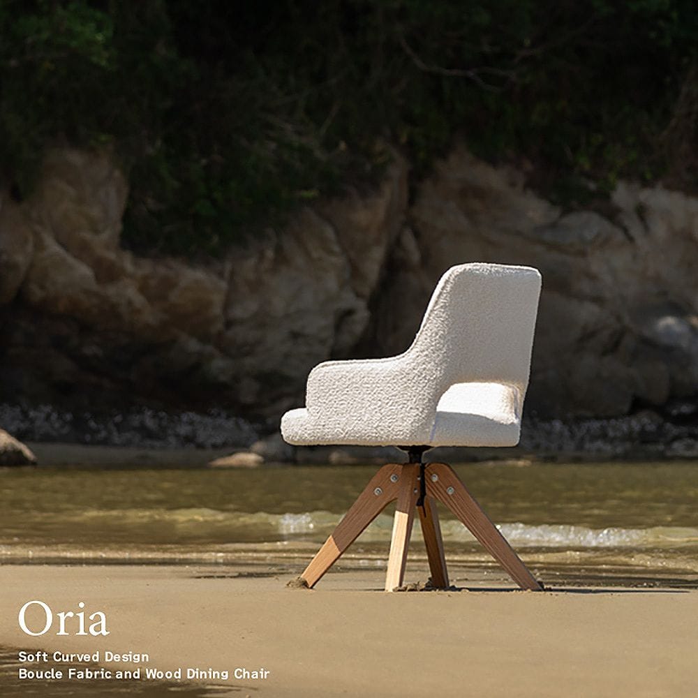 曲線と直線のバランスが美しい、ダイニングチェア『Oria(オリア)』。光の角度によって表情を変えるブークレ生地と天然木オーク材が、空間に上質な印象を与えます。身体に沿った背もたれと、ゆったり座面の快適な座り心地。座面は360°の回転が可能で、立ち座りもスムーズ。 毎日の食卓を、より優雅で心地よいひとときへと導きます。製品重量:9.4kg 組立式(約20分)