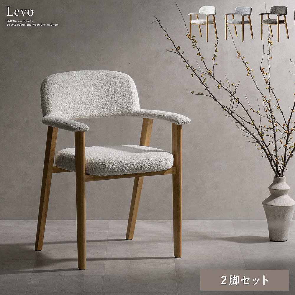 やわらかなラインが美しい、ダイニングチェア『Levo(レヴォ)』。温かな色合いの天然木素材と、光の角度によって表情を変えるブークレ生地が、上質な空間を演出。一体化した背もたれとアームが身体を包み込み、ゆったりとした座面が、長く座っても疲れにくい、快適な座り心地を実現。毎日の食卓を、より優雅で心地よいひとときへと導きます。製品重量:7.9kg