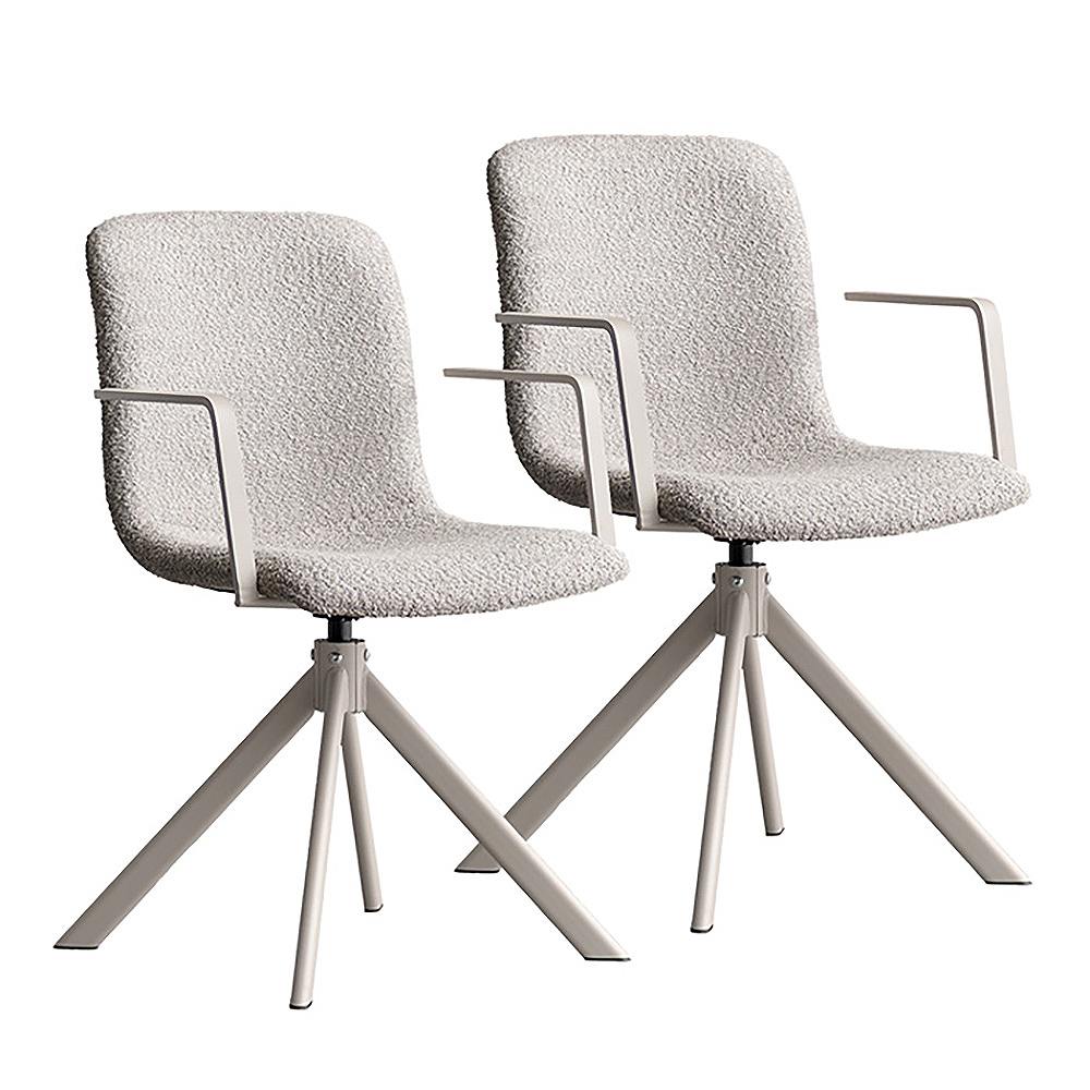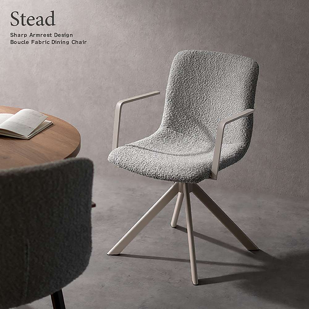 シャープなアームが美しい、ダイニングチェア『Stead(ステッド)』。光の角度によって表情を変えるブークレ生地と直線的なアームレストが、空間に上質で、モダンな印象を与えます。身体をフィットする背もたれと、ゆったり座面の快適な座り心地。座面は360°の回転が可能で、立ち座りもスムーズ。毎日の食卓を、より優雅で心地よいひとときへと導きます。製品重量:9.1kg