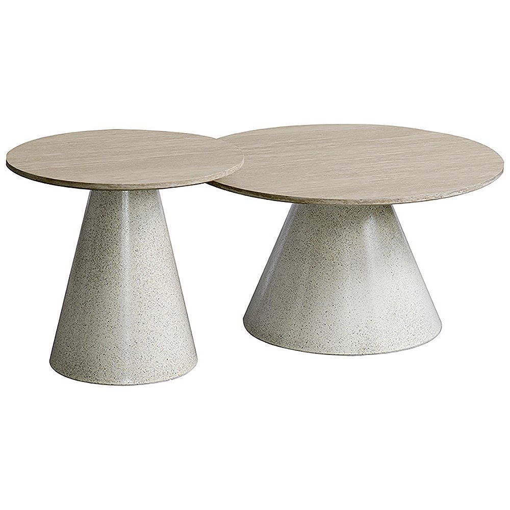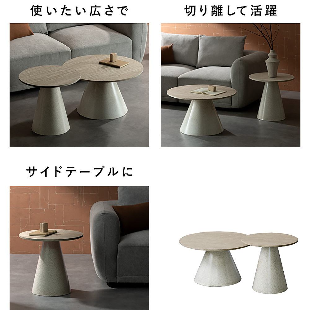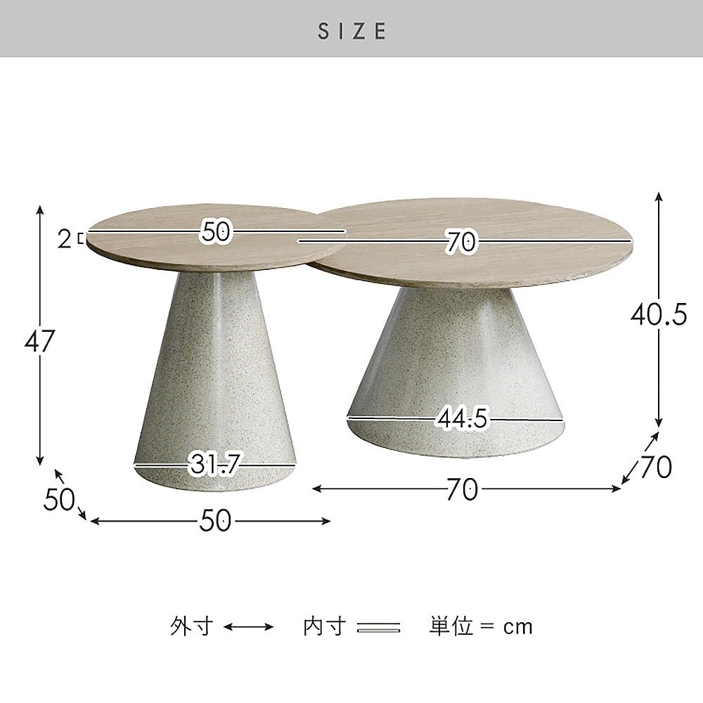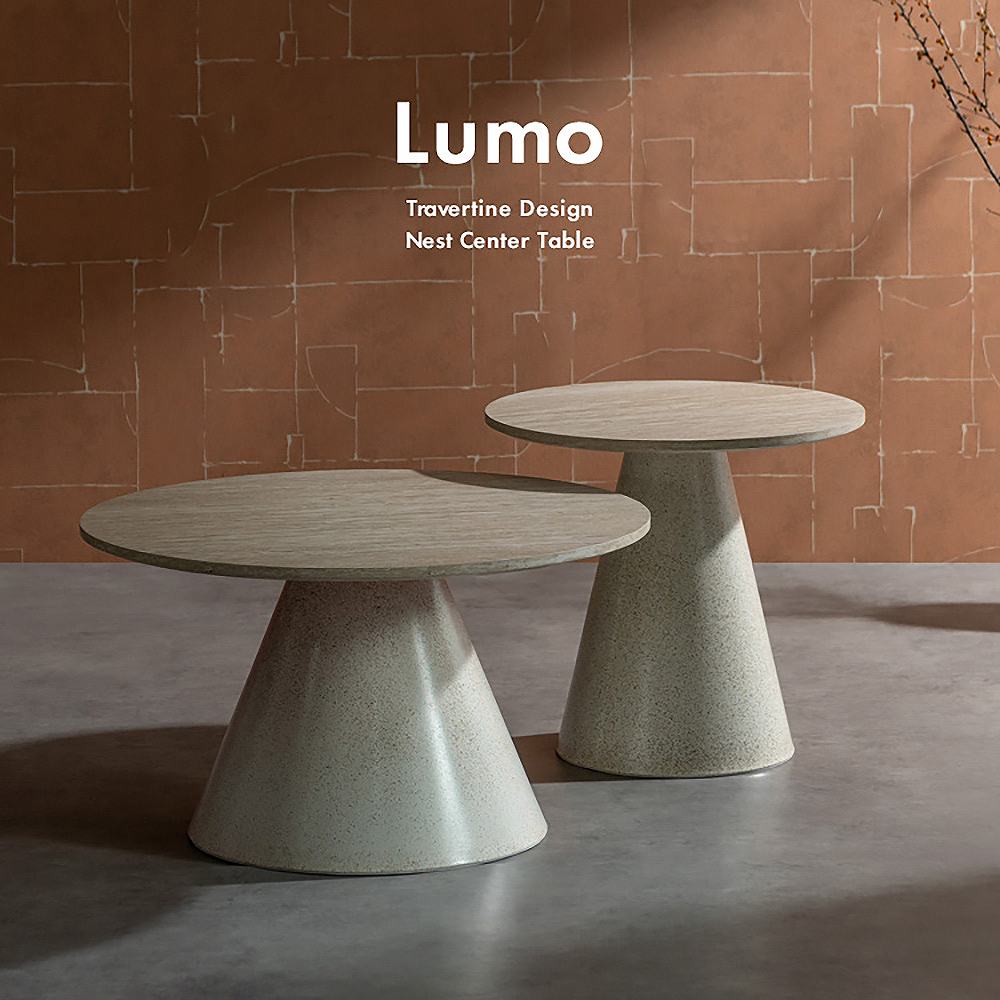 不規則な穴や縞状の独特な模様の天然石トラバーチン(石灰岩)を模した天板と円錐デザインが印象的なネストセンターテーブル『Lumo(ルモ)』。サイズの異なる二つのテーブルは重ねたり切り離したり、自由なレイアウトが可能でリビングや寝室などお家の色々な場所ででお使いいただけます。製品重量:大6.25、小4kg 組立式(約10分)