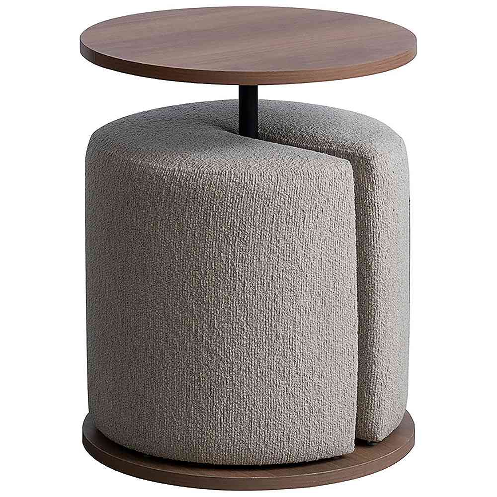 木目柄のラウンドサイドテーブルと天板下に収納できるスリット付きのスツールがセットになった『Lien(リエン)』。必要なときにサッと取り出せるスツールは来客時などに便利にお使いいただけます。カラーはナチュラルとブラウンの2カラーからお部屋の雰囲気やお好みでお選びいただけます。製品重量:11.9kg 組立式(約15分)