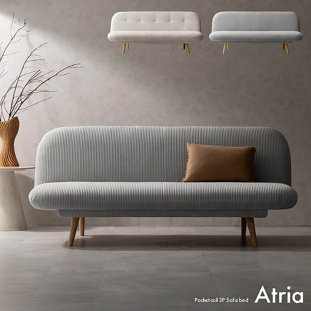 丸みのある柔らかい印象のデザインとポケットコイルを使用した贅沢な座り心地が特徴の三人掛けソファベッド『Atria(アトリア)』。ゆったり座れる広々とした座面設計で座るソファは、背もたれを倒せばゆとりのあるベッドに早変わり。ブークレ生地のホワイトと、コーデュロイ生地のライトグレーの2タイプをご用意。お好みでお選びいただけます。製品重量:33kg