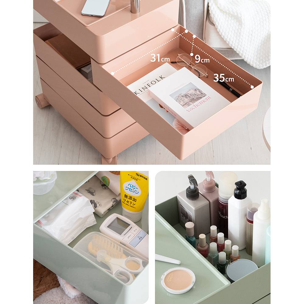 丸みのあるデザインが可愛い多段トローリーワゴン『Pluna(プルーナ)』。4輪キャスターでラクラク移動できます。棚はそれぞれ360度回転式で取り出しやすく、リビングや寝室、デスクなど色々なシーンでマルチにお使いいただけます。ベビー用品の収納にもオススメ。製品重量:12.4kg 完成品(キャスターのみ取り付け)