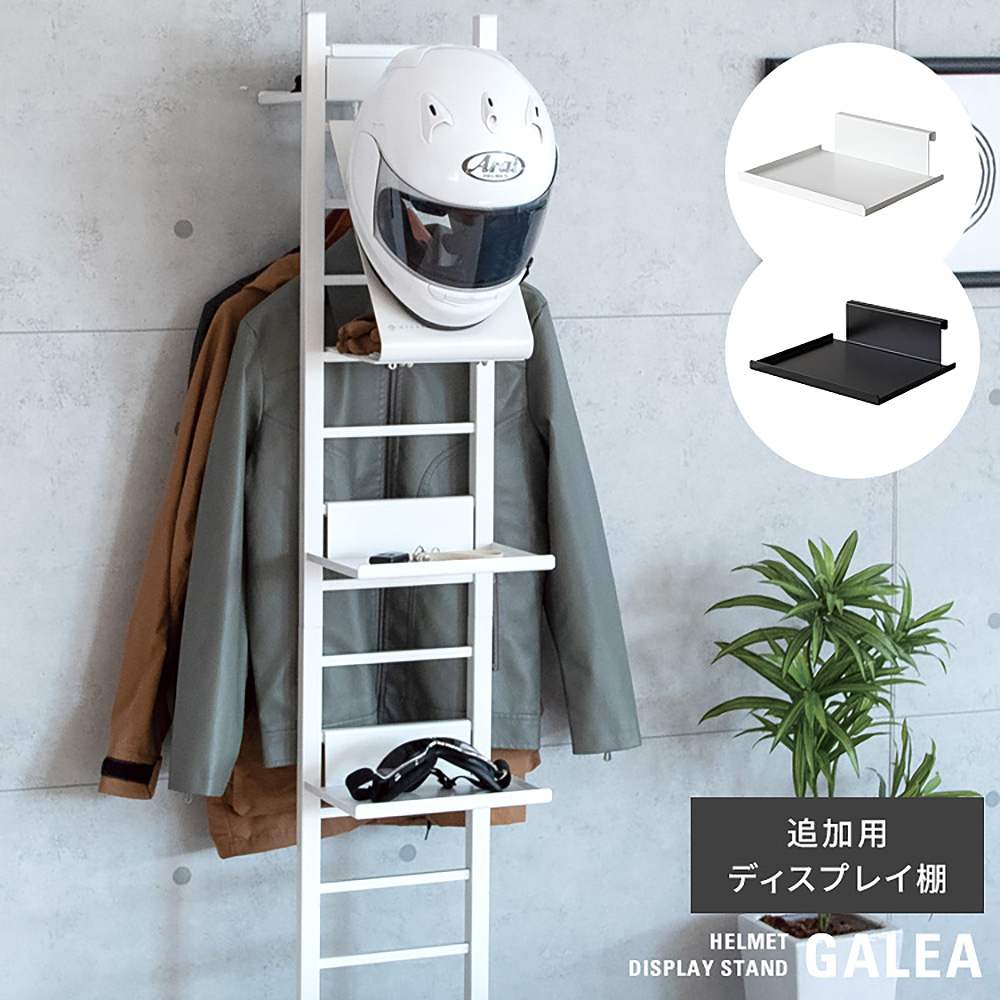 ライダーに人気のヘルメットディスプレイスタンド『GALEA(ガレア)』から追加用ディスプレイ棚が登場。ディスプレイ棚タイプとハンガーバー付きディスプレイ棚の2タイプがあります。 面倒な組み立ては不要で、スタンドに掛けるだけでキーやグローブが収納できる棚やジャケットやレインウェアを掛けるハンガーバーが追加できます。 ディスプレイ棚はホワイト、ブラック、木板付きのホワイト×ナチュラル、ブラック×ブラウンの4カラー。ハンガーバー付きはホワイトとブラックの2カラーをご用意。お好みでお選びいただけます。