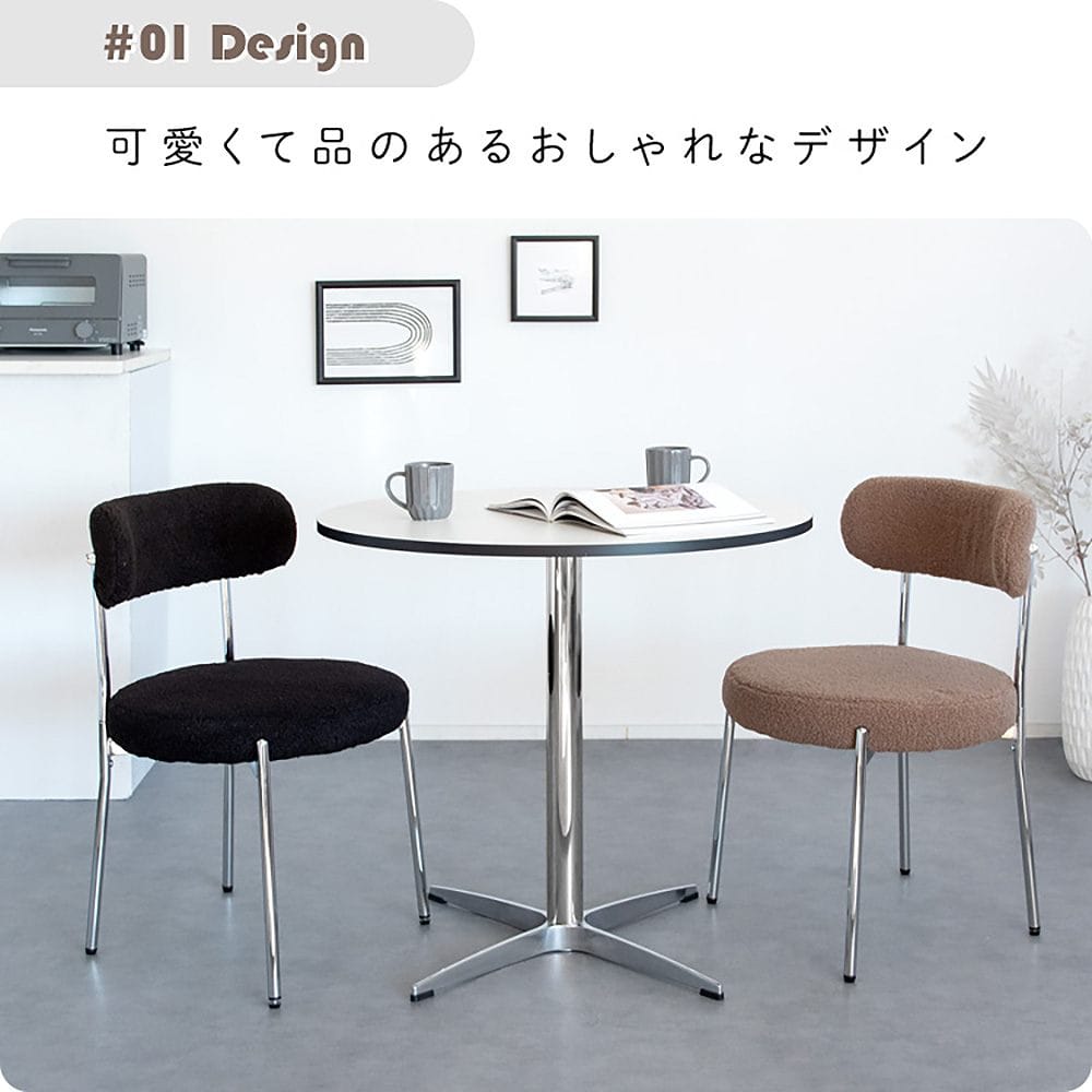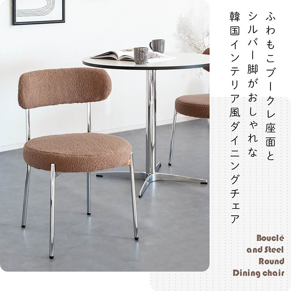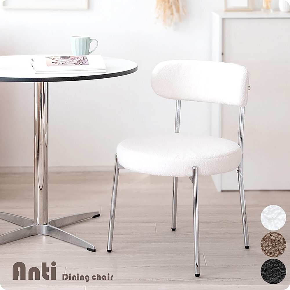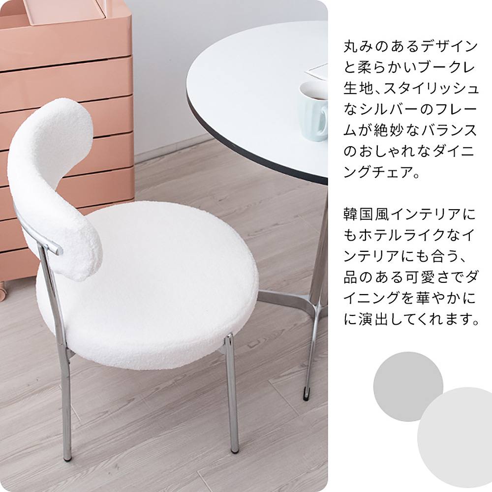 ふわもこなブークレ生地とシルバーフレームの丸くて可愛いダイニングチェア『Anti(アンティー)』。 身体を包み込む背もたれとゆったり座面で座り心地も快適。おしゃれな韓国風インテリアやホテルライクインテリアによく合います。 カラーはホワイト、グレージュ、ブラックの3カラーからお部屋の雰囲気やお好みでお選びいただけます。