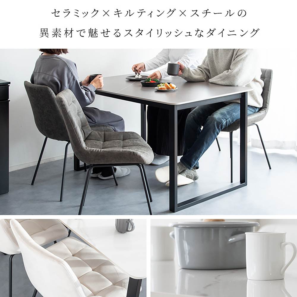 セラミック素材の大理石風天板のダイニングテーブルと、身体にフィットする形状でキルティングが施されたダイニングチェアのダイニングセット『Lement(レメント)』。 耐熱性や耐摩耗性に優れたセラミックは熱いお鍋やフライパンを直接置いたり、まな板なしで直接包丁でのカットができます。 お好みで選べるカラーはテーブルが鏡面仕上げのホワイトとグレー、マットなダークグレーの3カラー、チェアはPUレザータイプがホワイトとダークグレー、ベルベットがアイボリーとライトグレーの計4カラーをご用意。テーブルとチェア4脚の5点セット、テーブル単体、チェア2脚の販売がございます。