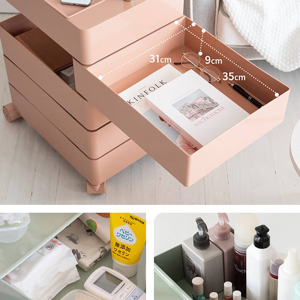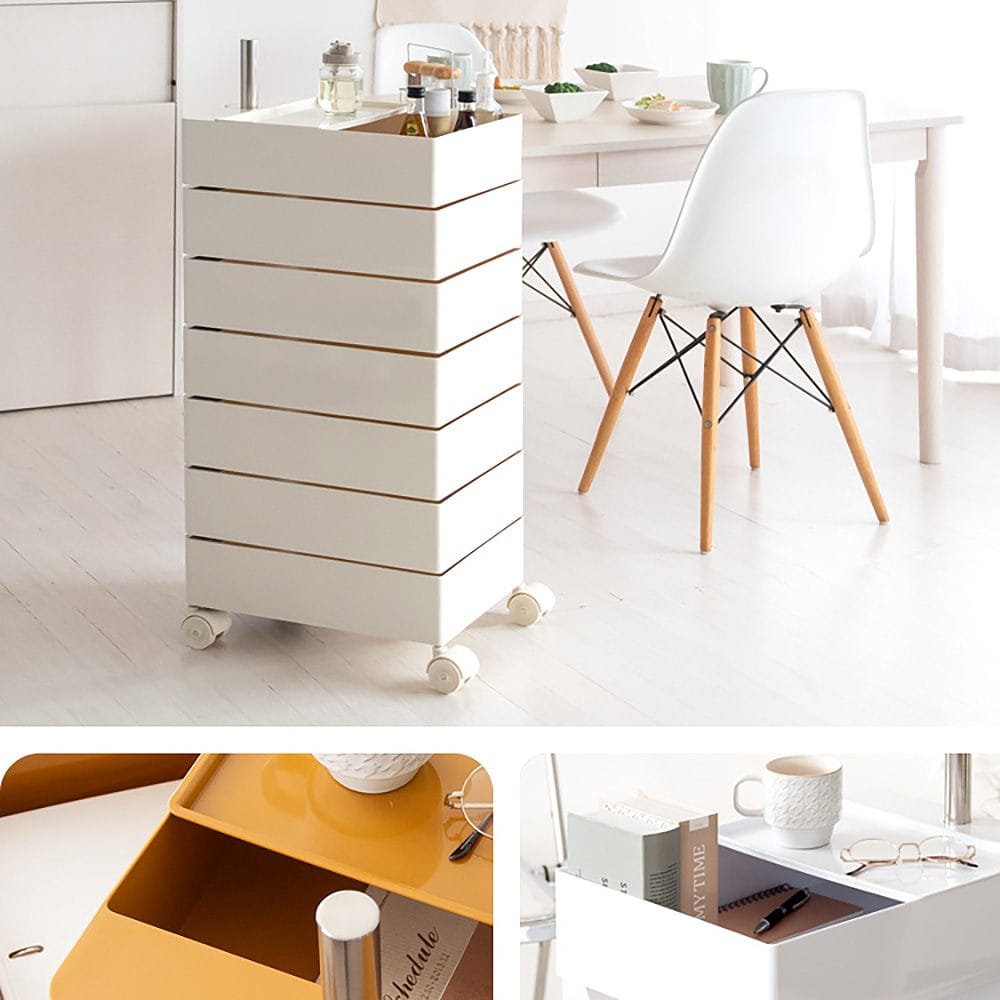 丸みのあるデザインが可愛い多段トローリーワゴン『Pluna(プルーナ)』。 4輪キャスターでラクラク移動できます。棚はそれぞれ360度回転式で取り出しやすく、リビングや寝室、デスクなど色々なシーンでマルチにお使いいただけます。ベビー用品の収納にもオススメ。 サイズは5段と7段の2タイプ、カラーはホワイト、クリーム、ライトピンク、ライトグリーン、イエロー、オレンジ、レッド、グリーン、ブラックの9色展開でお好みに合わせてお選びいただけます。
