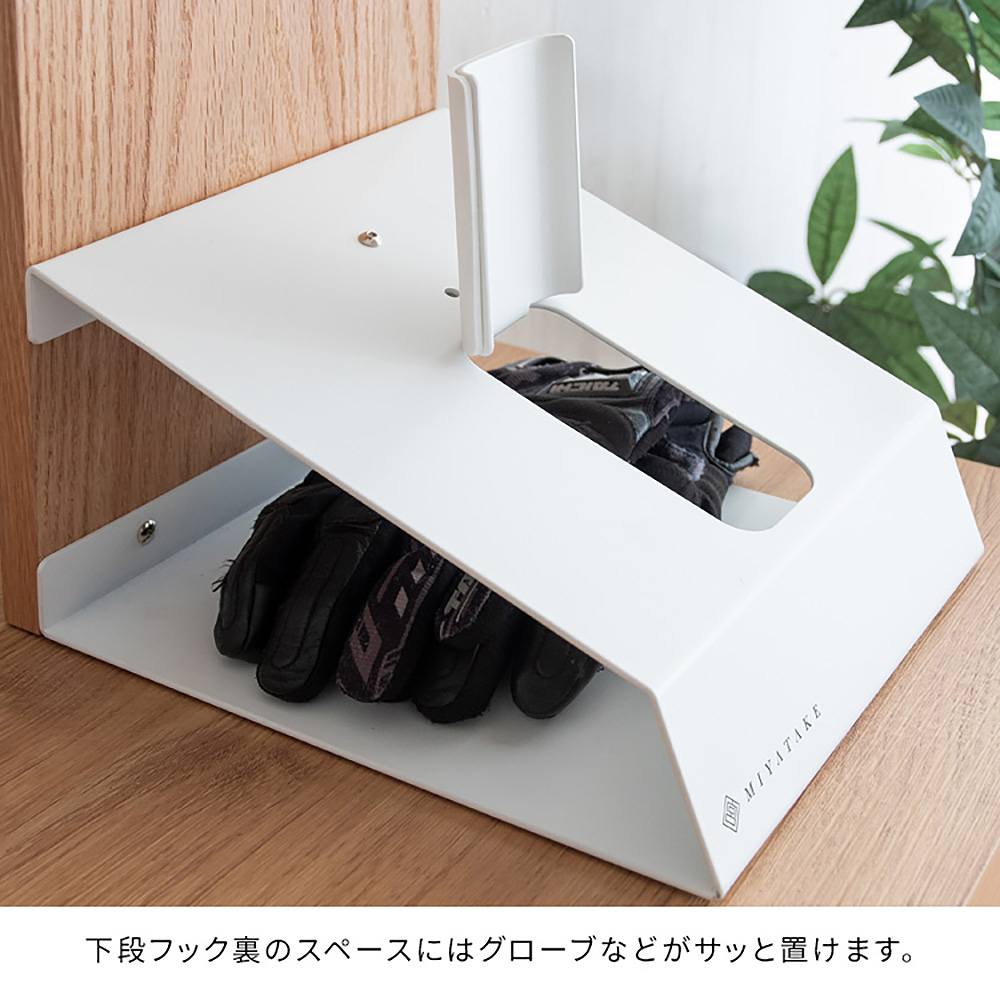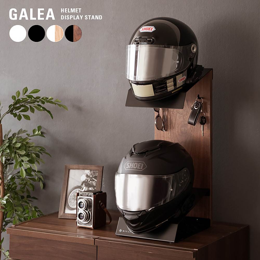 お気に入りのヘルメットを飾りながら省スペースに収納できるヘルメットディスプレイスタンドシリーズ『GALEA(ガレア)』。ヘルメットフック2個、バイクや車のキーが掛けられるフック2本、グローブを収納できる棚付きでお出かけの時に必要なものをまとめて収納できます。ヘルメットを上下に並べて置けるのでお出かけ時のコーディネートや気分で被りたい方をサッと取り出せます。