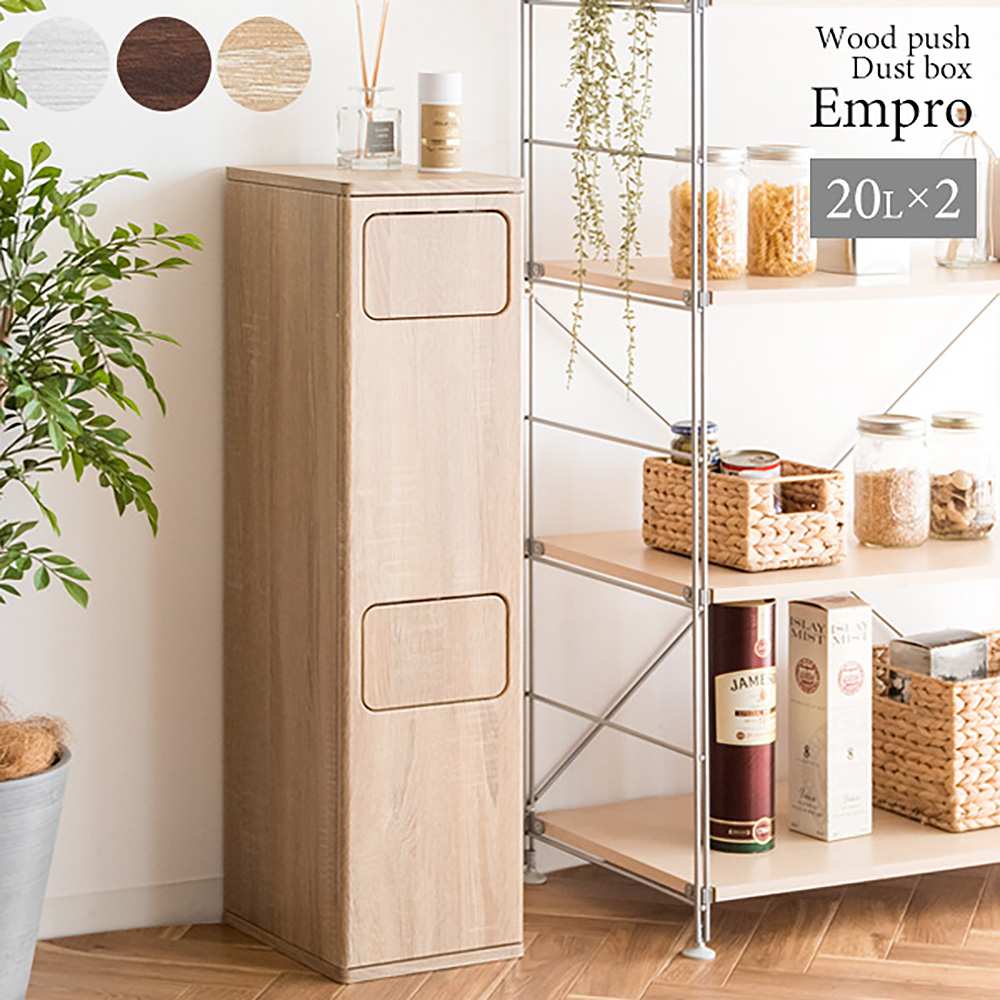 ゴミ箱に見えないスタイリッシュなデザインでお部屋に馴染む、木製プッシュ式ダストボックス『Empro(エンプロー)』の二段タイプ。スリムで場所を取らないので家具や家電のすき間に置けます。 それぞれ容量20Lでキッチンやリビングや寝室など色々なゴミが出る場所でも簡単に分別できます。ニオイが漏れにくく押すだけで簡単に捨てられるプッシュ扉式。ゴミ袋の着脱も簡単な前扉があり、利便性もバツグンです。