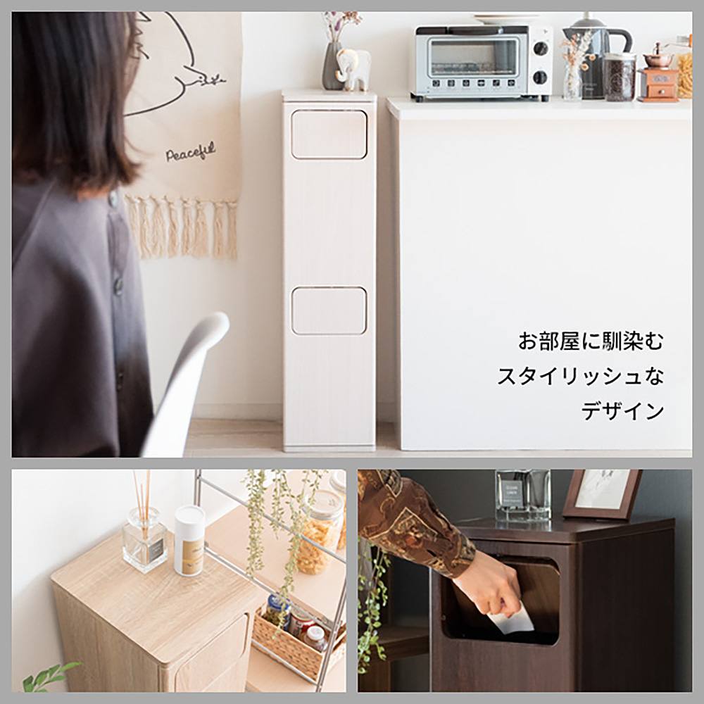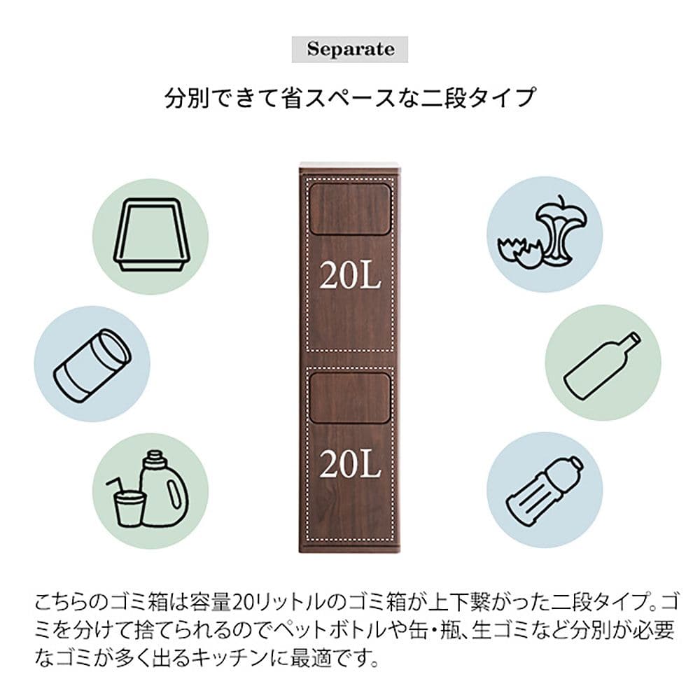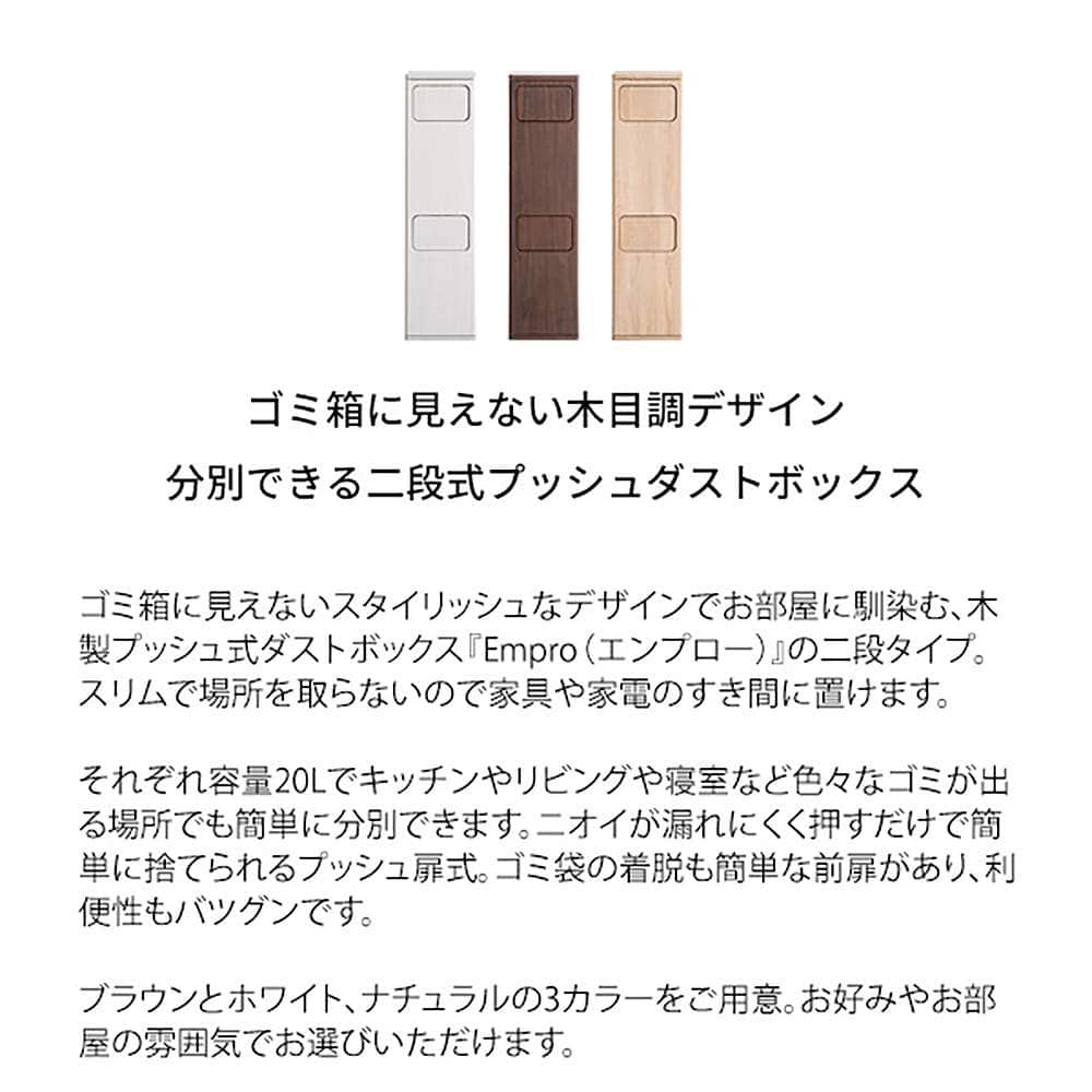 ゴミ箱に見えないスタイリッシュなデザインでお部屋に馴染む、木製プッシュ式ダストボックス『Empro(エンプロー)』の二段タイプ。スリムで場所を取らないので家具や家電のすき間に置けます。 それぞれ容量20Lでキッチンやリビングや寝室など色々なゴミが出る場所でも簡単に分別できます。ニオイが漏れにくく押すだけで簡単に捨てられるプッシュ扉式。ゴミ袋の着脱も簡単な前扉があり、利便性もバツグンです。